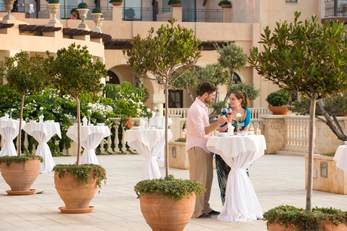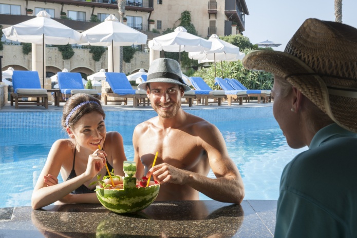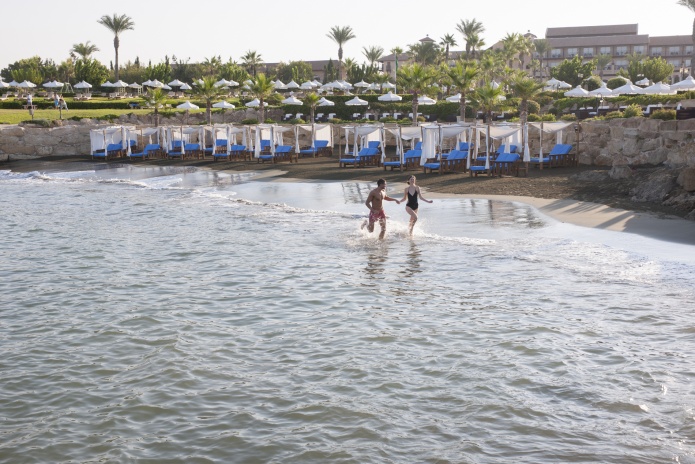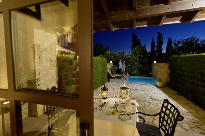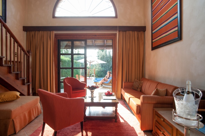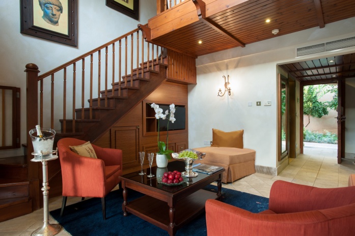 Royal Garden Villa with Private Pool (60 кв.м+балконы, терраса и бассейн, максимальное размещение – 3 взрослых или 2+2). Виллы с частными бассейнами и садами расположены в некотором отдалении от главного корпуса и сосредоточены вокруг стилизованной площади, окруженной лимонными деревьями. Все виллы - двухуровневые и оформлены в традиционном кипрском стиле. В интерьере воссоздано убранство кипрского сельского дома с антресольными спальными галереями и двусветным жилым пространством. Этот тип размещения идеально подходит для тех, кто стремится к уединению и спокойствию. В номере: двуспальная кровать, балкон для верхнего этажа или терраса с частным бассейном для нижнего этажа, двойные и 2 обычных лежака, ванная комната из мрамора с ванной, ручным душем, туалетом, биде и увеличительным зеркалом на нижнем этаже, ванная комната из мрамора с душевой кабиной, туалетом, биде и увеличительным зеркалом на верхнем этаже, полы из мрамора и паркета, мини-бар, телефон с голосовой почтой, ЖК-телевизор (2 шт) со спутниковыми каналами, фен, неограниченное использование Wi-Fi, туалетные принадлежности, iPod док-станция, кофемашина Nespresso, туалетный столик, вино, фрукты и минеральная вода по прибытии, ежедневная газета, банные халаты и тапочки.