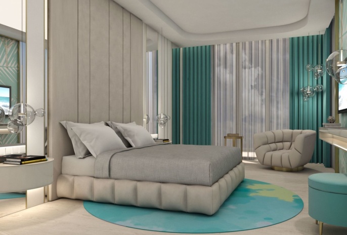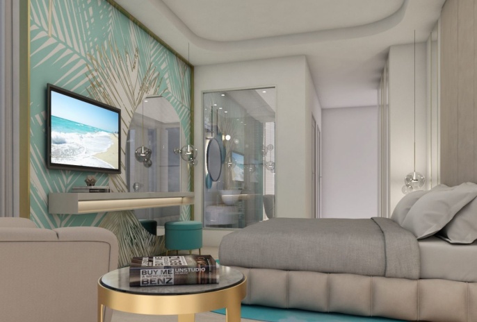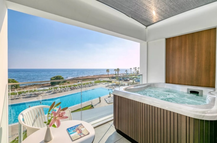 Junior Suite Front Sea View And Outdoor Jacuzzi (33 м² + большой балкон с джакузи, максимальное размещение - 3 человека + ребенок до 2 лет) – номер с видом на море и джакузи под открытым небом на террасе / балконе площадью 11,5 - 27 м². Просторный номер с 1 двуспальной кроватью и 1 односпальной кроватью. При размещении с младенцем предоставляется детская кроватка.
