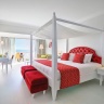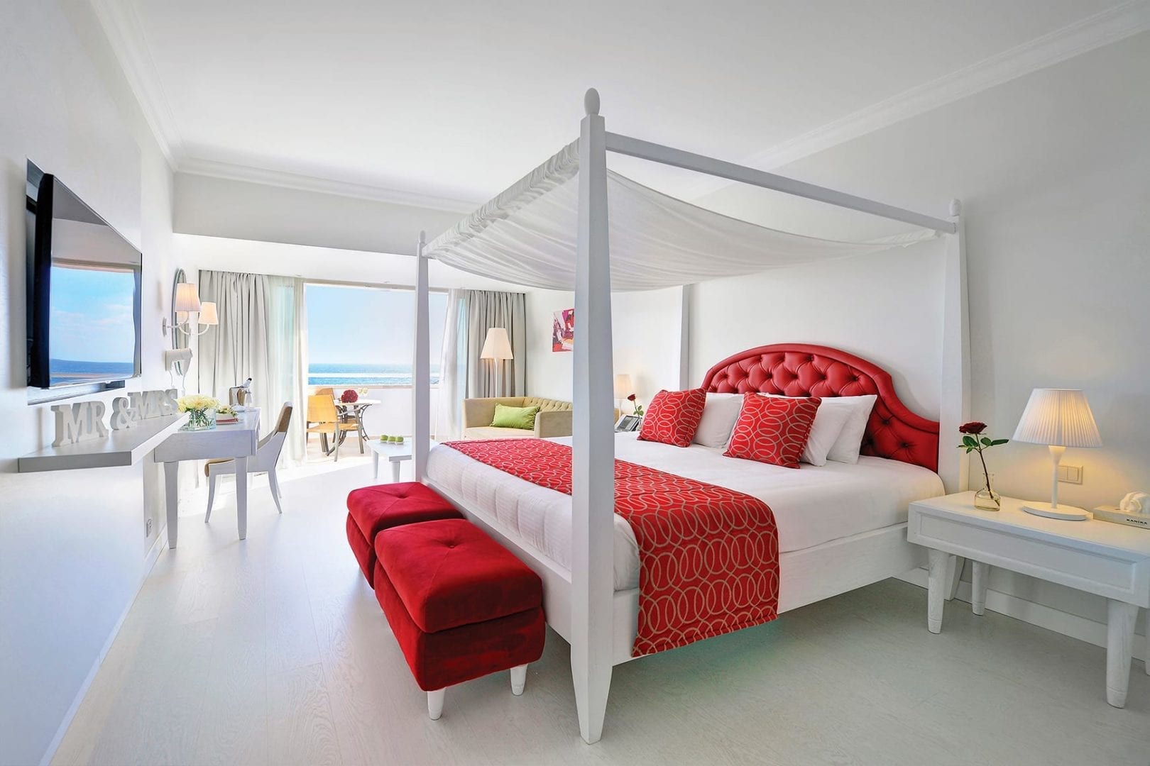 Расположенные в крыле только для взрослых (для гостей 18+). Cоздан для пар, акценты в красных тонах придают романтическое настроение светлому интерьеру. Двуспальная кровать king-size с балдахином, небольшой диван, ванная комната с ванной и душем, балкон, вид на море.
