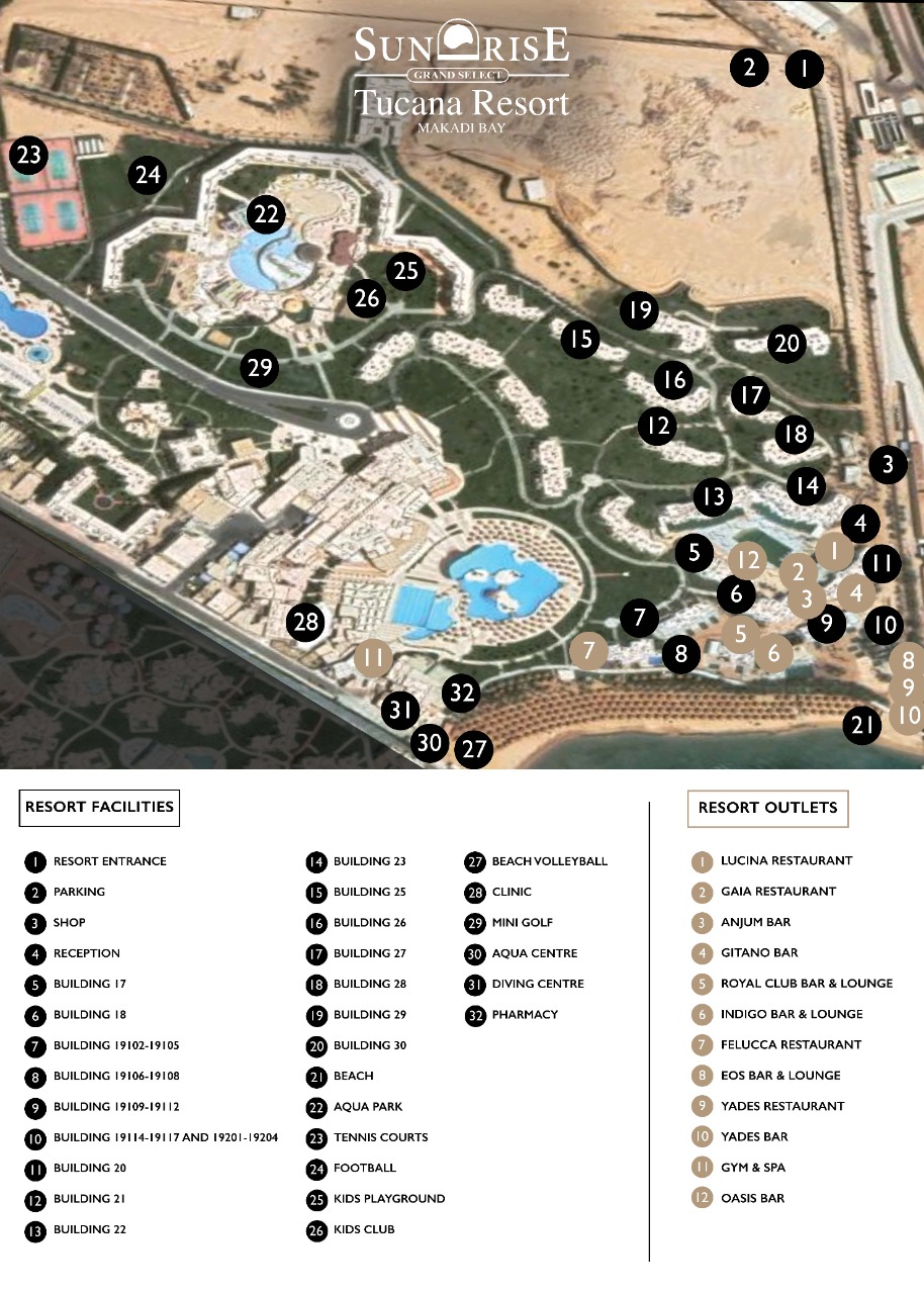 Sunrise Tucana Resort Grand Select расположен в самом центре Макади Бэй – главного региона с лучшими районами для дайвинга и снорклинга. На территории отеля 3 открытых бассейна, детских клуб, спа-центр, теннисные корты. В Sunrise Tucana имеется несколько ресторанов и баров, где подают как местные, так и международные блюда. Гостям предлагается возможность питания по системе «Всё включено», что позволяет наслаждаться разнообразием блюд и напитков. Также доступны различные водные виды спорта и анимационные программы.
