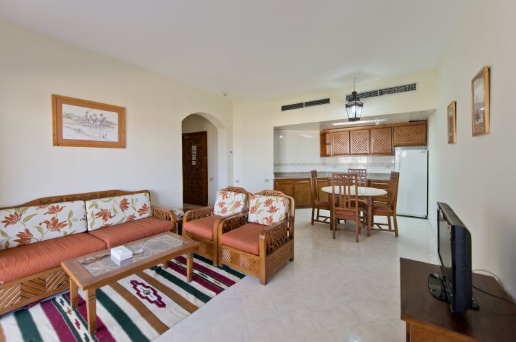 Вид на бассейн, 2 спальни (1 двуспальная кровать или 2 односпальные), отдельная гостиная комната с диваном и обеденным столом, 2 ванные комнаты  с душем, балкон или терраса;