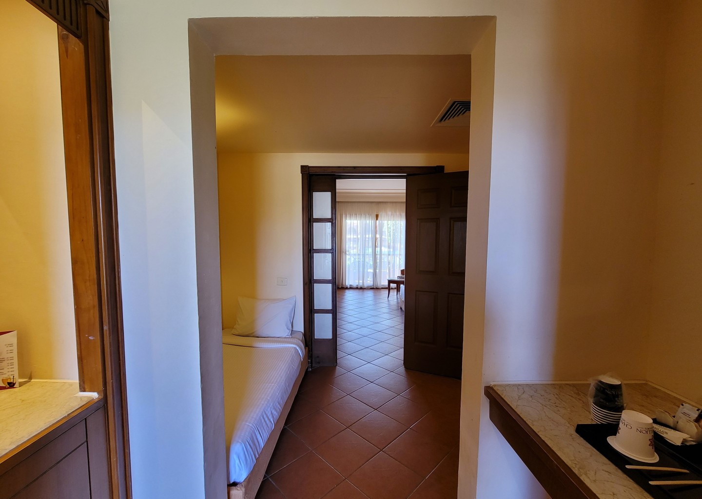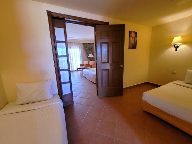 Двухкомнатный семейный номер: главная спальня с 1-й двуспальной/ 2-мя односпальными кроватями и гостевым уголком, отдельная зона в холле с 2-мя односпальными кроватями, ванная комната с душевой кабиной, меблированный балкон, вид на бассейн, (дизайн номеров может немного отличаться);