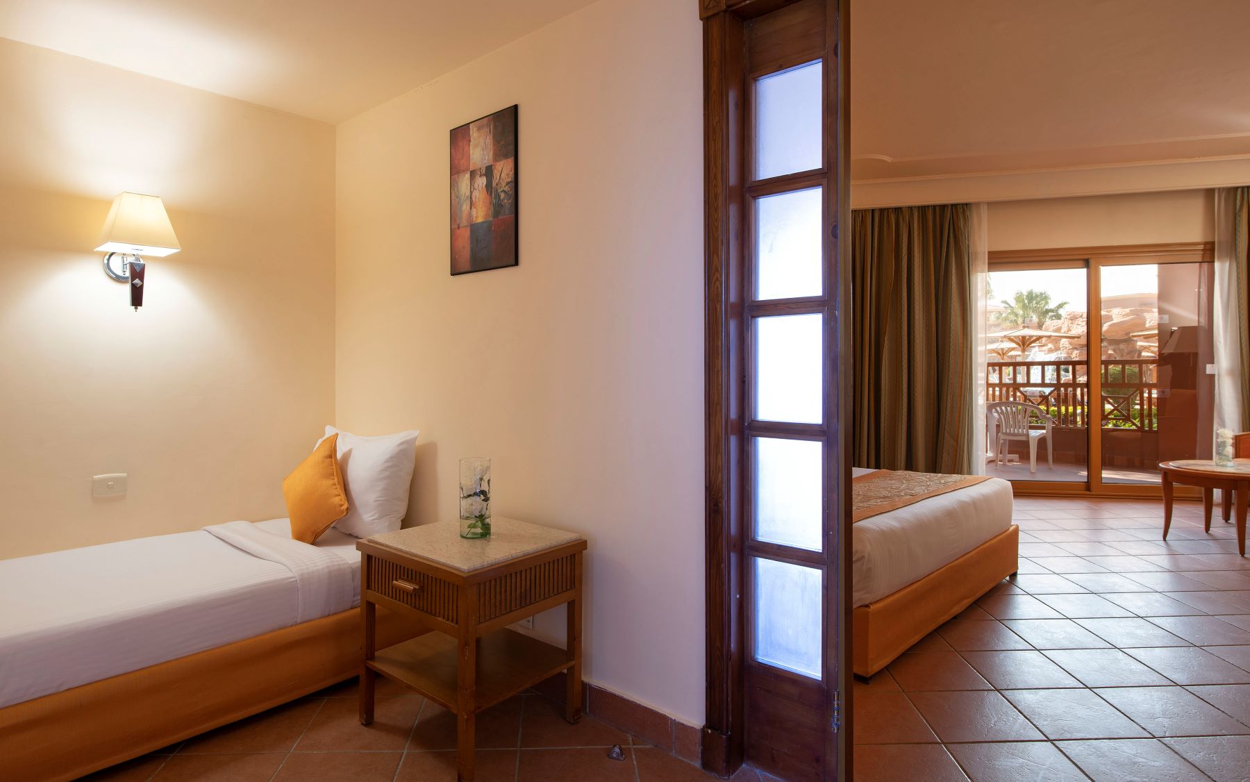 Двухкомнатный семейный номер: главная спальня с 1-й двуспальной/ 2-мя односпальными кроватями и гостевым уголком, отдельная зона в холле с 2-мя односпальными кроватями, ванная комната с душевой кабиной, меблированный балкон, вид на сад, (дизайн номеров может немного отличаться);
