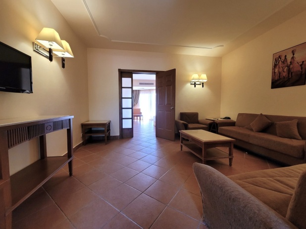 Двухкомнатный семейный люкс: спальня с 1-й двуспальной/2-мя односпальными кроватями и гостевым уголком, гостиная с 2-мя диванами-кроватями, 2 телевизора, ванная комната с душевой кабиной, меблированный балкон, вид на бассейн и сад.