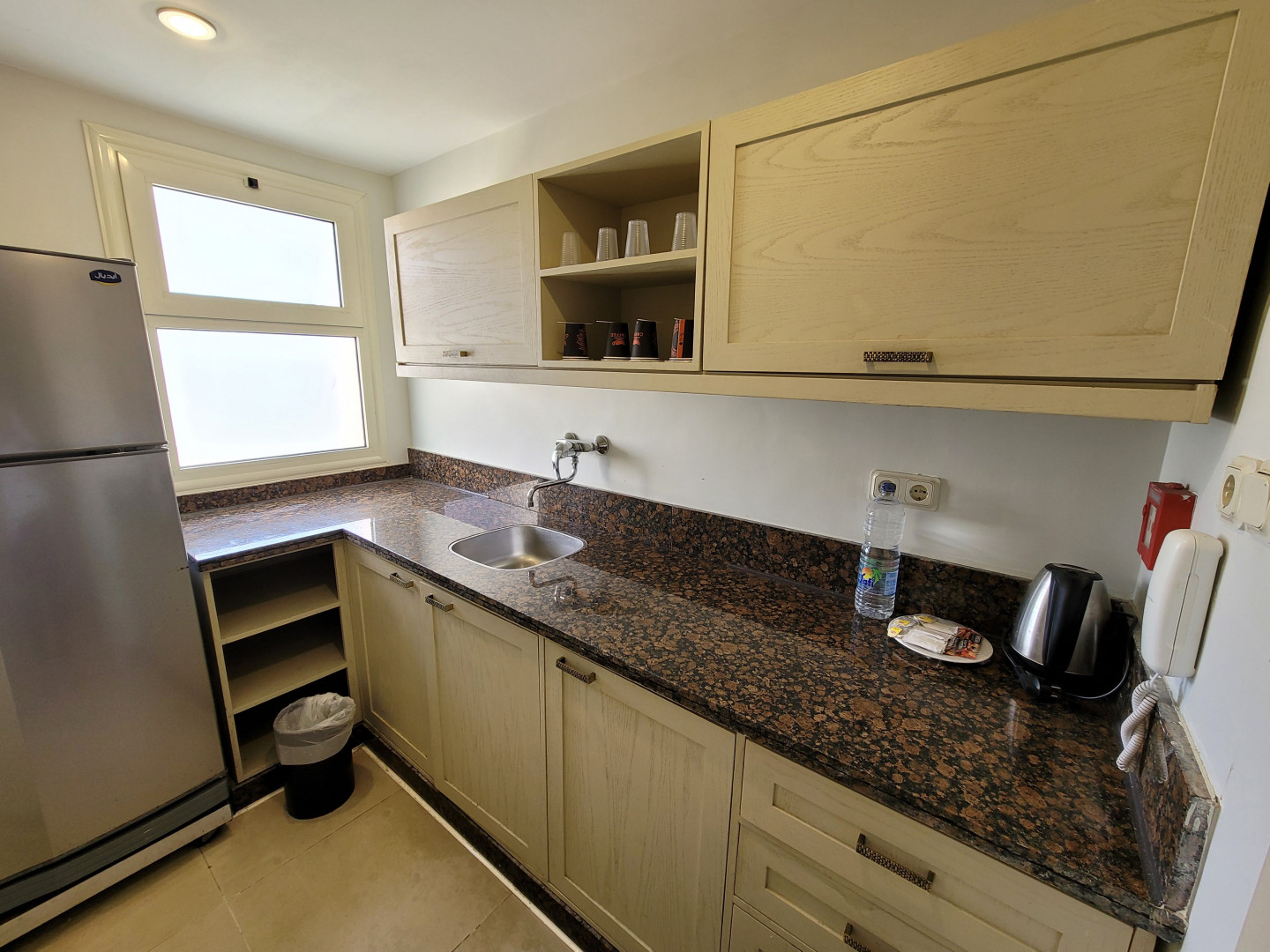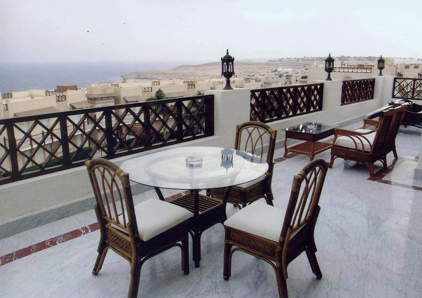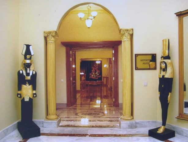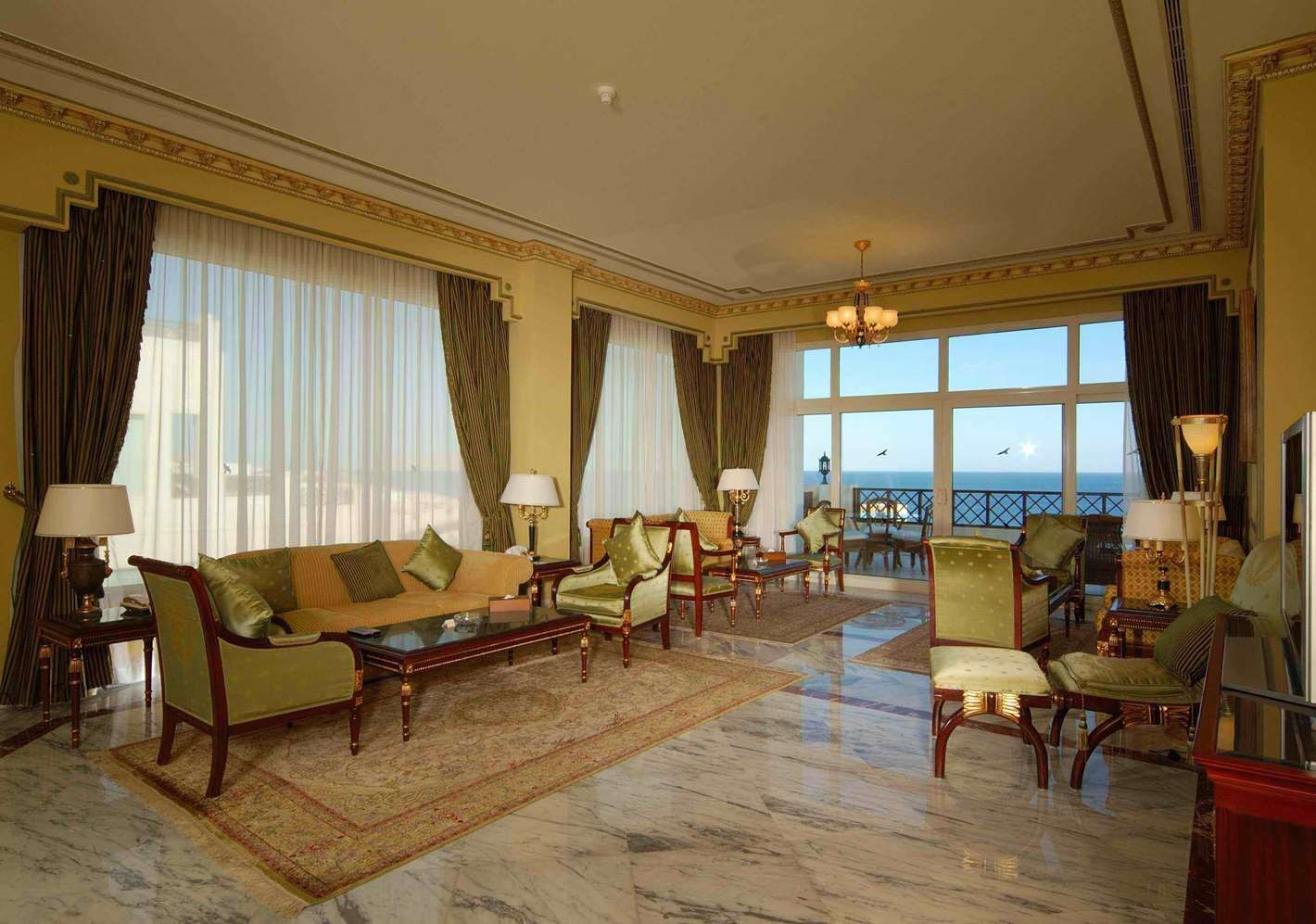 Королевский сьют с 4-мя спальнями расположен на верхнем этаже: главная спальня с кроватью king size с ванной комнатой, джакузи и гардеробной, а также 3 спальни и 3 ванные комнаты  с душевыми, большой салон-гостиная, разделенный на зоны, столовая с обеденным столом на 8 персон, кухня, кабинет-офис с рабочим столом и необходимым подключением интернета и телефонии, просторная меблированная терраса, вид на Красное море, отдельный вход; услуги дворецкого;