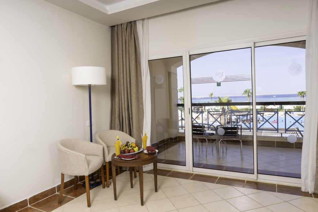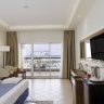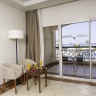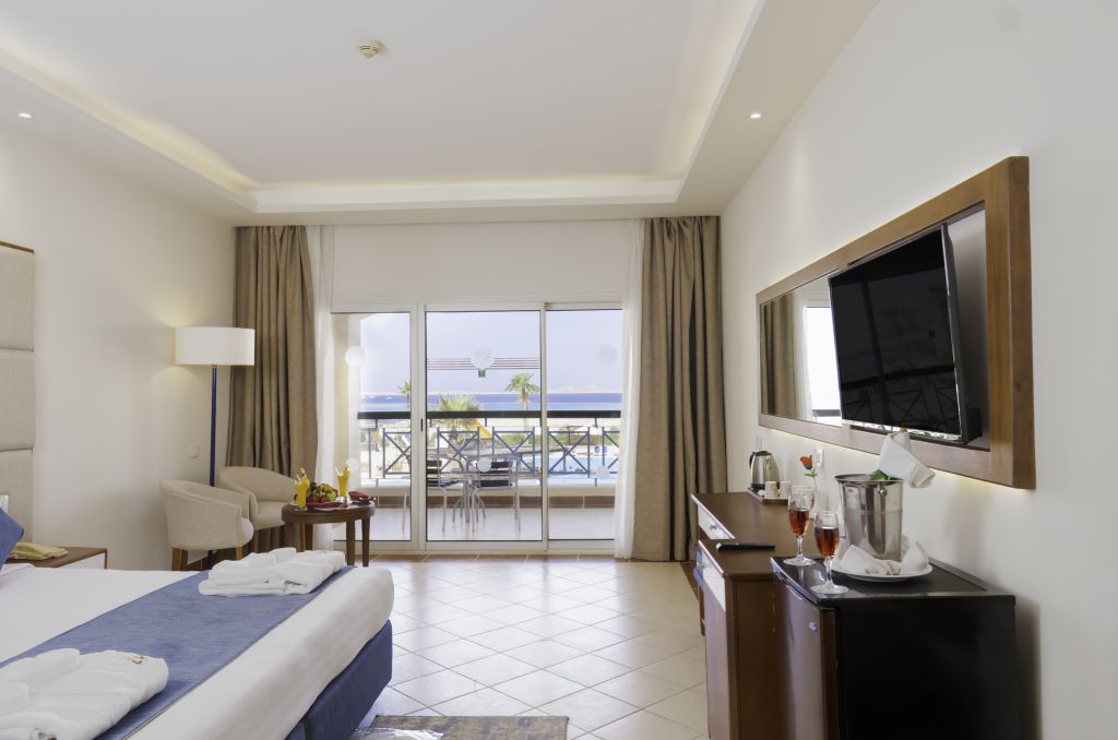 Двуспальная кровать king-size или 2 односпальные кровати, гостиная зона с креслами, ванная комната (комбинация ванна-душ), балкон или терраса, вид на море.
