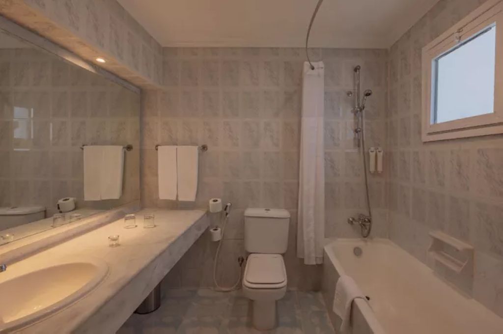 Двуспальная кровать queen-size или 2 односпальные кровати, небольшой диван-кресло в номерах с двуспальной кроватью, ванная комната (комбинация ванна – душ), терраса, боковой вид на море;