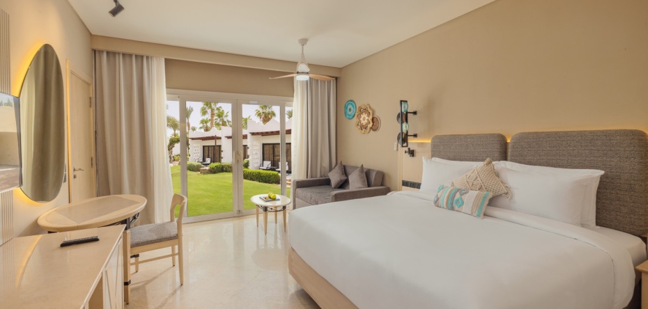 Расположены ближе к морю, двуспальная кровать queen-size, гостиная зона с диваном, ванная комната с душем, балкон или терраса, вид на сад, халат, тапочки, весы;