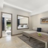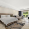 Спальня с двуспальной кроватью, гостиная комната, терраса или балкон, вид на сад и бассейн;
