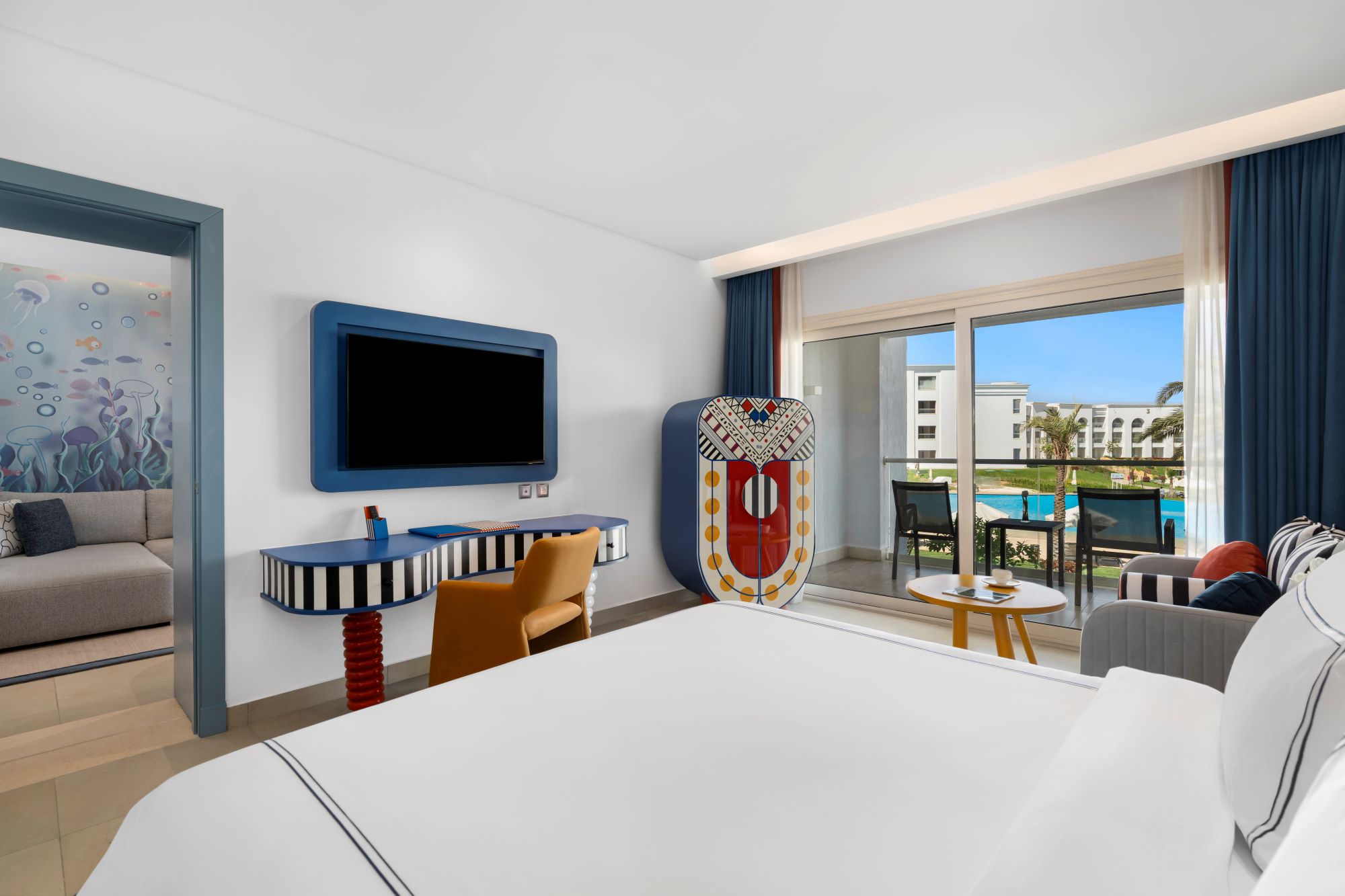 Семейный номер с 2-мя спальнями, каждая с собственной дверью: спальня с двуспальной кроватью и зоной отдыха, спальня с 2-мя односпальными кроватями, отдельная ванная комната с душевой кабиной, меблированный балкон/ терраса, вид на сад/ бассейн;