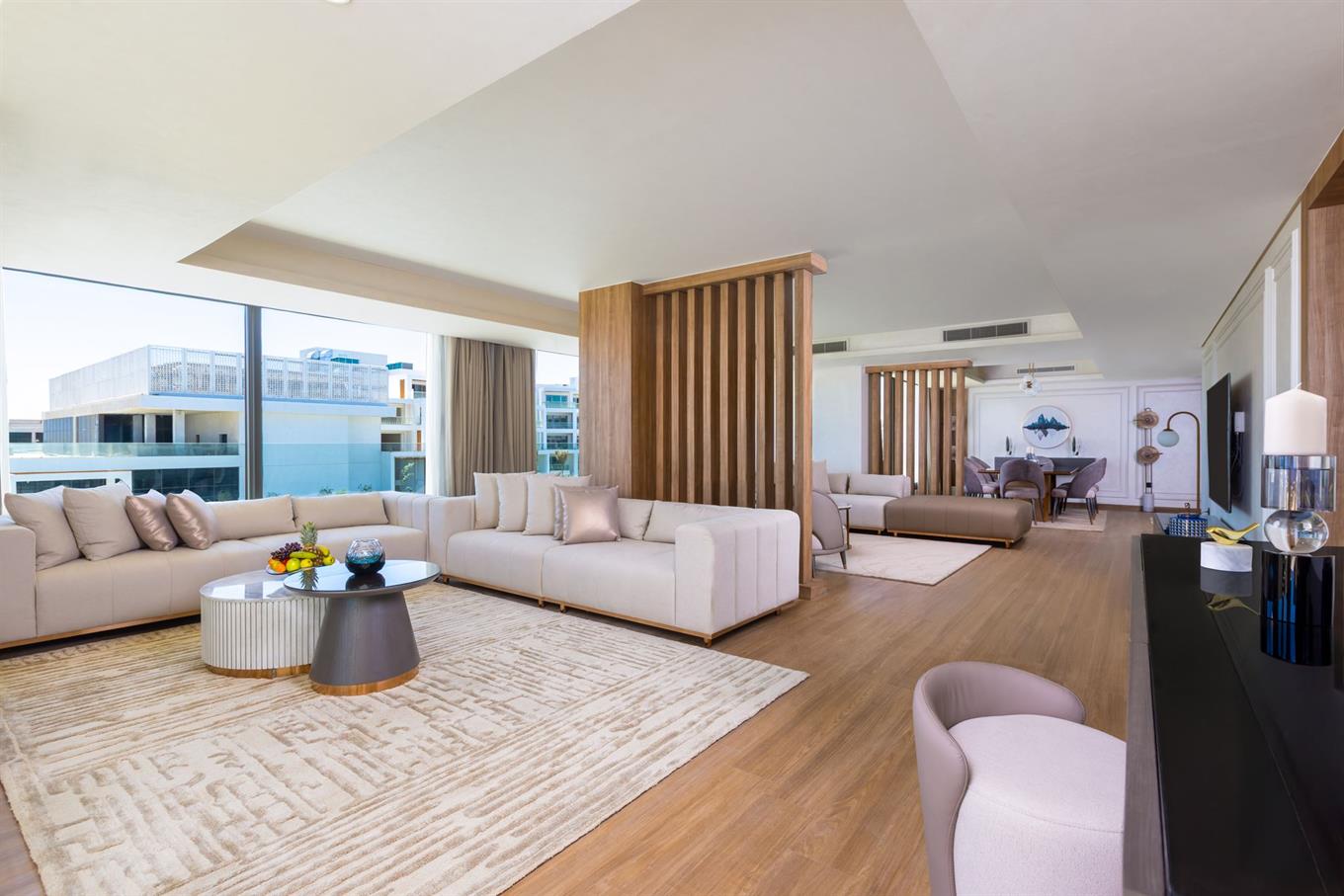Президентский люкс на 1-й линии с 2-мя комнатами: спальня с двуспальной кроватью и зоной отдыха, просторная гостиная с раздельными зонами отдыха и обеденной зоной, гардеробная, ванная комната с двойной раковиной и ванной, большая меблированная терраса/ балкон, вид на пляж/ на море;