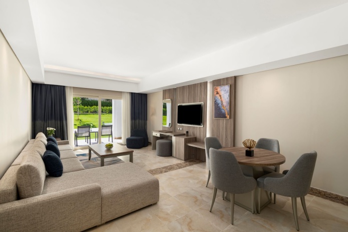 Полулюкс с 2-мя комнатами: спальня с двуспальной кроватью, отделенная дверью гостиная с диваном и обеденной зоной, ванная комната с душевой кабиной, меблированный балкон/ терраса, вид на бассейн/ на сад;