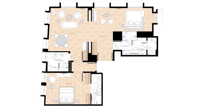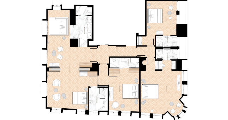 На третьем и четвертом этажах отеля, 4 спальни, 5 ванных комнат с душем, отдельная гостиная комната с обеденной зоной, см.план номера.