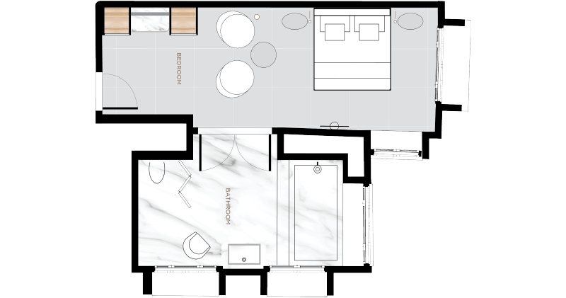 Номера на первом и втором этажах отеля, двуспальная кровать, кресло, ванная комната с душем, абсолютная конфиденциальность от окон или балконов соседних номеров, возможно сделать смежным с номером Grand Deluxe Room, см.план номера;