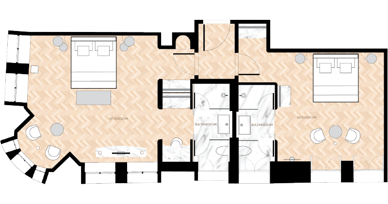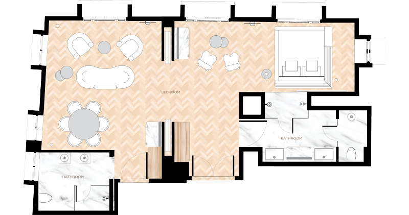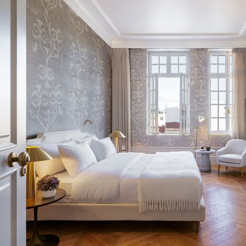 Расположены на первом и втором этажах отеля, характеризуются драгоценными произведениями искусства, двуспальная кровать, гостиная зона с креслами и обеденным столом, ванная комната с душем, см.план номера;