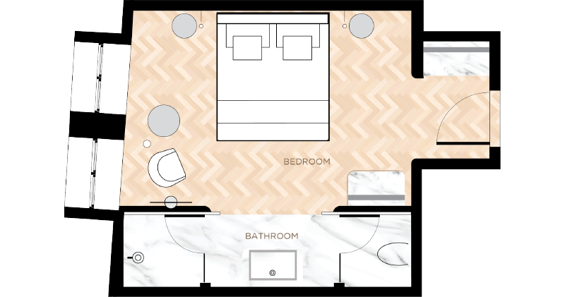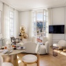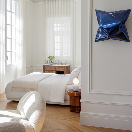 На первом, втором и третьем этажах, двуспальная кровать, кресло, ванная комната с душем, современные произведения искусства, прямой или боковой вид на улицу, возможно сделать смежным с номером Bjou Room, см.план номера;