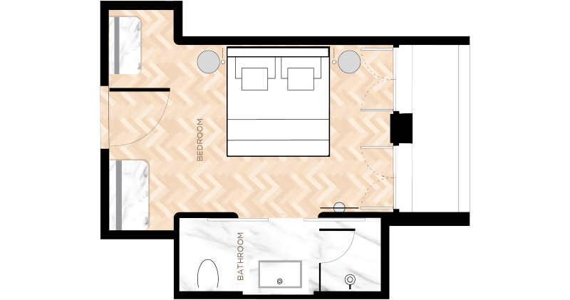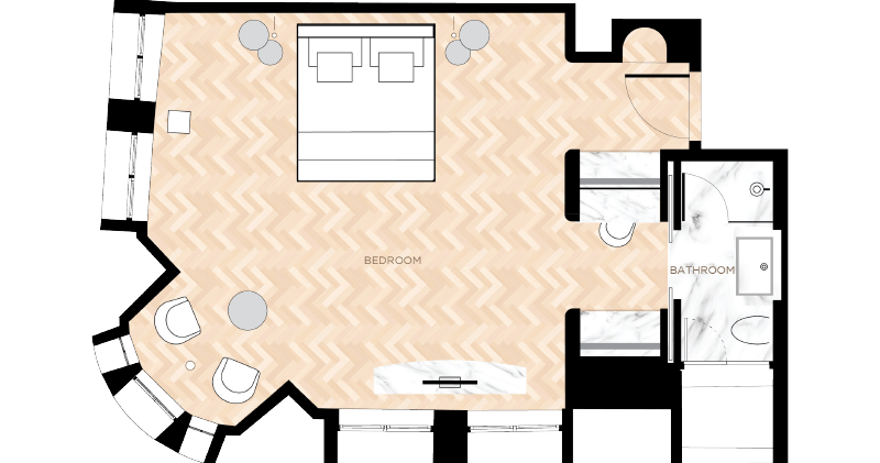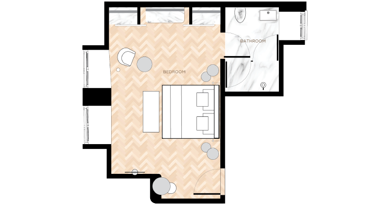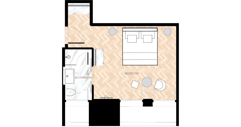 Размещены на всех этажах отеля, просторный номер, двуспальная кровать, гостиная зона с креслами, возможно поставить дополнительную кровать, ванная комната с душем, в некоторых номерах есть балконы с собственными ванными комнатами, все номера залиты естественным светом через пять больших окон с видом на шумный город, возможно совместить с номером Deluxe Room или Deluxe Balcony Room, см.план номера;