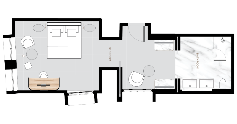 Номера расположены на всех этажах отеля, двуспальная кровать, кресло, большие окна, ванная комната с душем, прямой или боковой вид на улицу, возможно совместить с номером Metropolis Junior Suite или Acropolis Junior Suite, см.план номера;