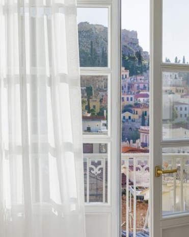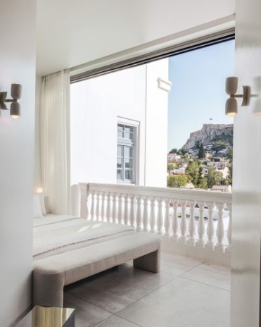 На первом и четвертом этажах отеля, двуспальная кровать, кресло, ванная комната с душем, балкон, прямой или боковой вид на улицу, вид на Акрополь из некоторых номеров, возможно совместить с номером Metropolis Junior Suite, см.план номера;
