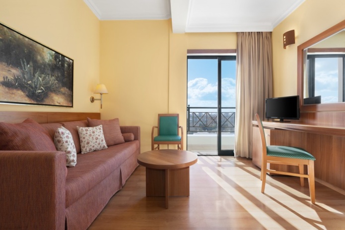 Номера расположены в основном здании (корпус А), боковой вид на море, спальня с двуспальной кроватью, отдельная гостиная комната с диваном-софа, ванная комната с ванной, балкон или терраса.