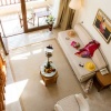 Двухуровневые бунгало, гостиная комната с двуспальным диваном-софа и ванная комната с душем на первом этаже, спальня с двуспальной кроватью и ванная комната с ванной на втором этаже, меблированный балкон, вид на бассейн;
