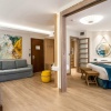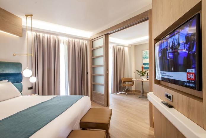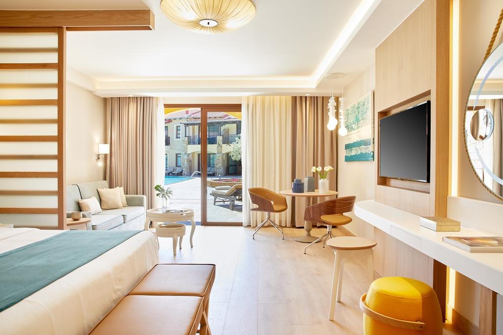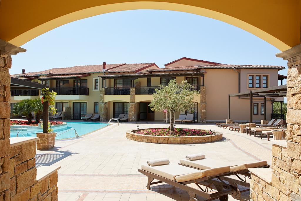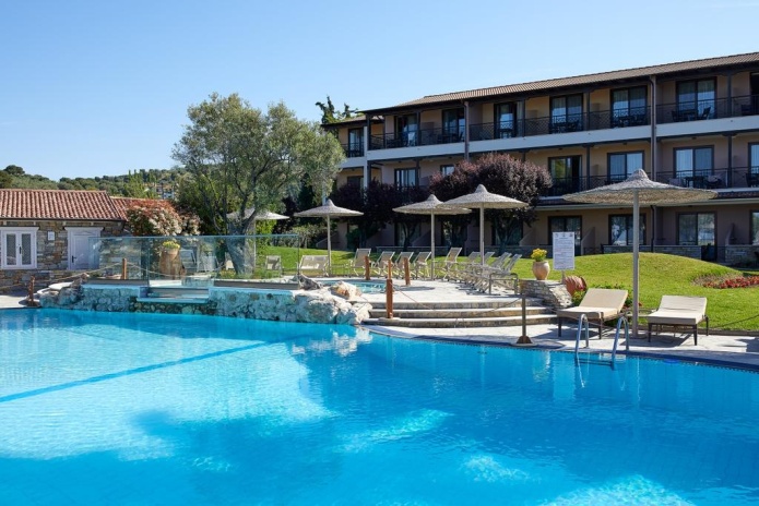 Отель состоит из двух трехэтажных корпусов: центрального и корпуса с сьютами в традиционном греческом стиле.