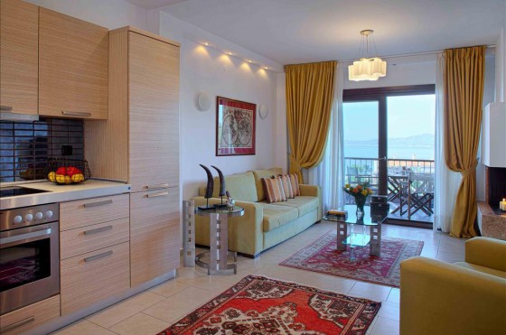 5 Athos Deluxe Villas (80 м2) Расположены на 2-ом этаже. Двухуровневые виллы (в стиле мезонеты). Каждая со своим стилем. На виллах: большой меблированный салон с камином, полностью оборудованная кухня, столовая, 2 спальни, 2 ванные комнаты с душем, внутренняя деревянная лестница, балкон, частный сад, вид на море (берег Комицы). Возможное размещение до 4-5 взрослых.