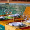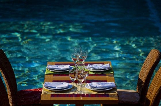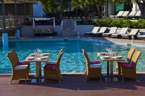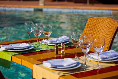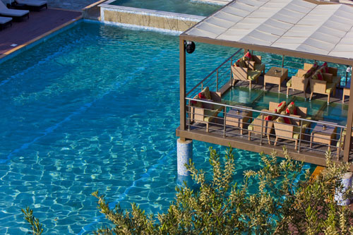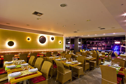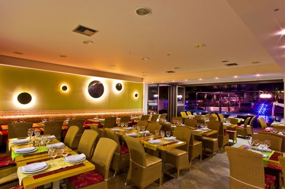 Главный ресторан, центральный бар и бар у бассейна со стеклянным настилом.