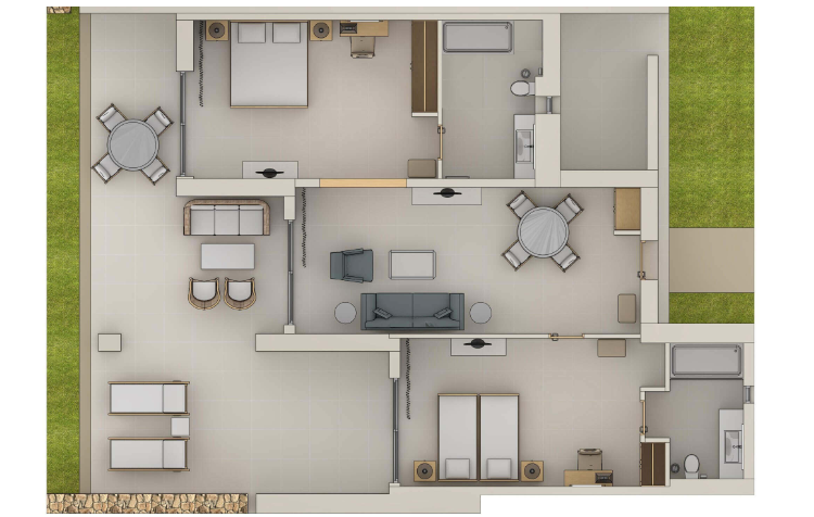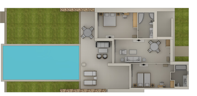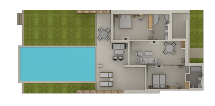 Номера расположены в одноэтажных бунгало, 2 спальни (двуспальная кровать и 2 односпальные кровати), 2 ванные комнаты (одна – с ванной и душевой кабиной, вторая - с душевой кабиной), частный сад с прямым доступом к эксклюзивному бассейну делюкс коллекции, вид на бассейн, план номера, фото номера;