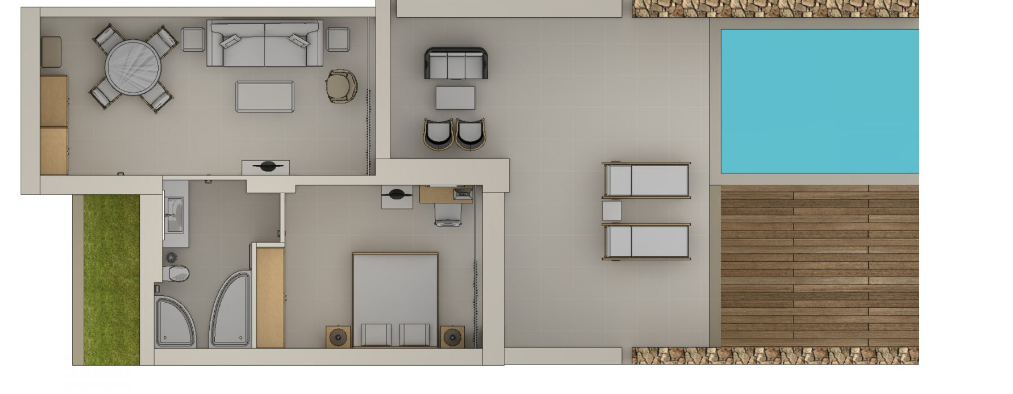 Номера расположены в одноэтажных бунгало, спальня с двуспальной кроватью, гостиная комната с диваном-кроватью, ванная комната с ванной и душевой кабиной с тропическим душем, частный сад с прямым доступом к эксклюзивному бассейну, вид на бассейн, план номера, фото номера;