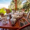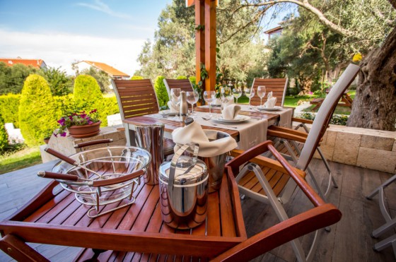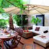 На террасе: плетеная мебель (диванчик и кофейный столик), двухметровый обеденный стол из тикового дерева с 6 стульями, шезлонги и большой зонт от солнца.