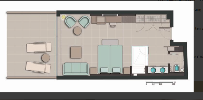 Спальня с двуспальной или 2 односпальными кроватями, гостиная комната , ванная комната с ванной или душем, балкон, вид на море, привилегии Miraggio Club, план номера;