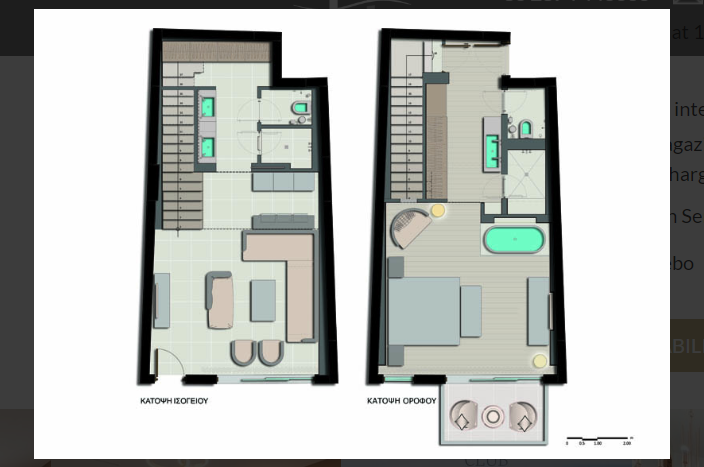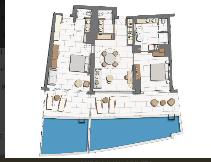 Двухэтажные номера, гостиная комната с диваном, спальня с двуспальной кроватью и ванной, 2 ванные комнаты, балкон, терраса с частным бассейном, план номера;