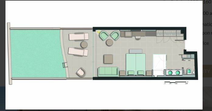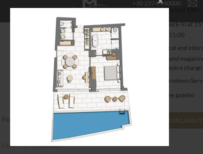 Двуспальная кровать, гостиная зона с диваном-софа размера 180 x 160 см, ванная комната с ванной или с душем, меблированная терраса, частный бассейн, вид на море, привилегии Miraggio Club, план номера;