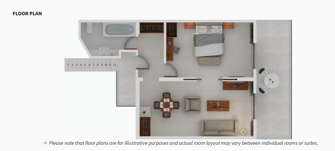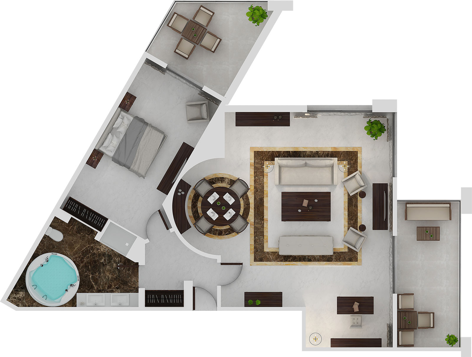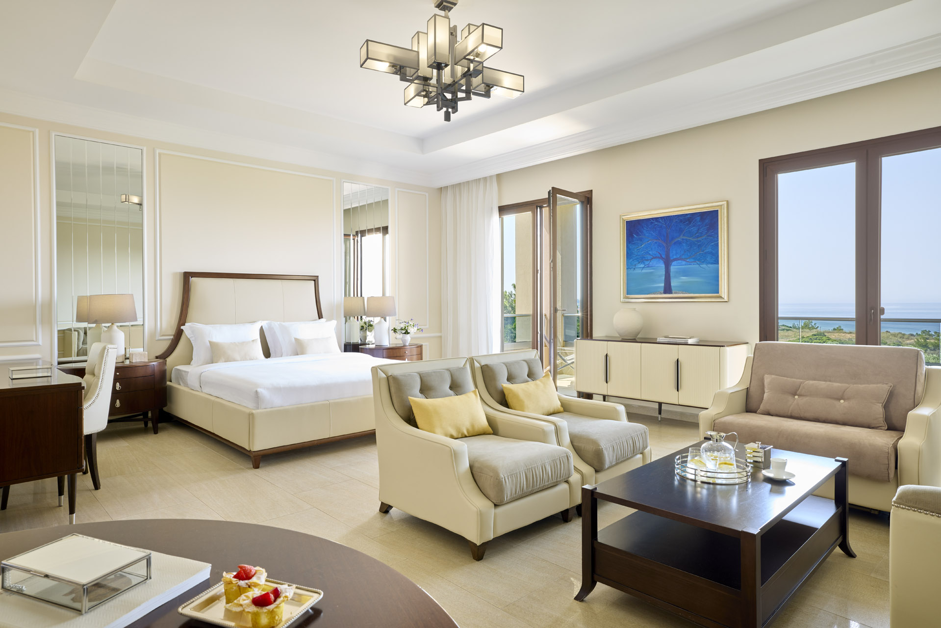 Спальня с двуспальной кроватью king-size, отдельная гостиная комната с диваном и обеденным столом (раздвижные двери между комнатами), ванная комната с гидромассажной ванной, балкон, вид на сады или боковой вид на море, один ребенок в возрасте до 12 лет проживает бесплатно на имеющихся кроватях, при размещении 2+2: один ребёнок на односпальном диване, второй на на стандартном диване, план номера;