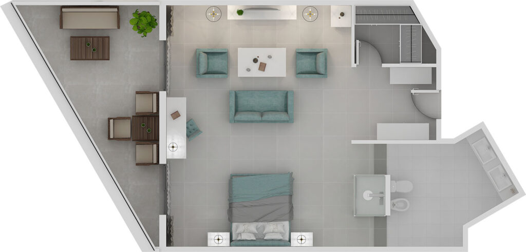 Просторный номер открытой планировки, двуспальная кровать king-size, гостиная зона с диваном и креслами, ванная комната с душевой кабиной, высокие потолки, балкон, вид на море, дети в возрасте до 12 лет проживают бесплатно на имеющихся кроватях, план номера.