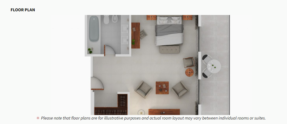 Просторный номер открытой планировки, только для размещения взрослых гостей, двуспальная кровать king-size, гостиная зона с диваном и креслами, открытый двойной душ, расположенный буквально в гостиной, современная мебель, изготовленная по индивидуальному заказу, гардеробная, меблированный балкон или терраса, вид на сад, бесплатно беседка на пляже, план номера;