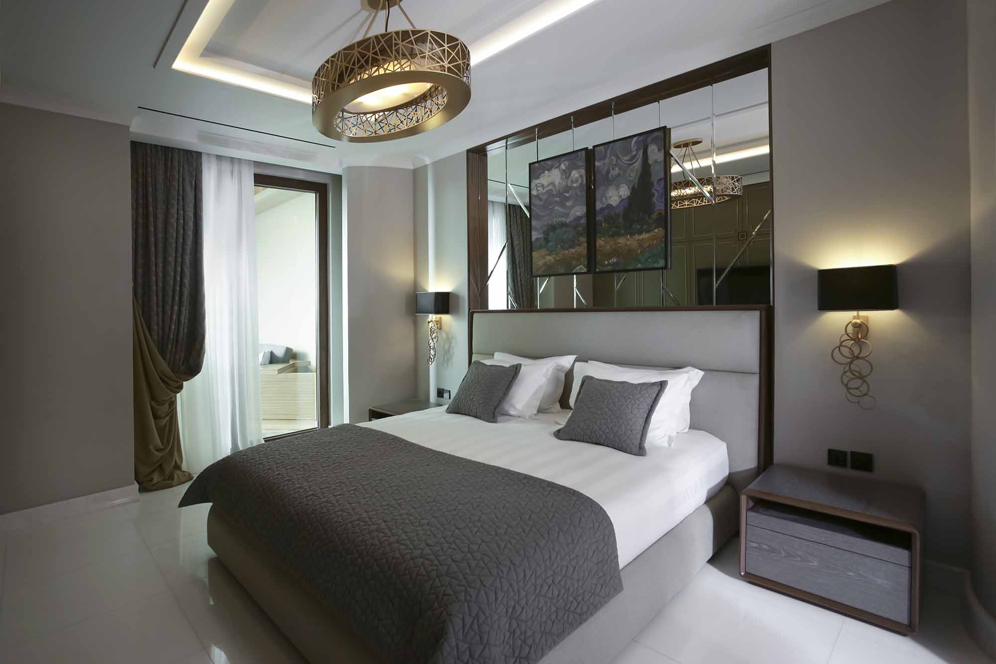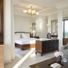 Спальня с двуспальной кроватью king-size (с кожаным изголовьем кровати ручной работы), очень большая гостиная комната (включая полноразмерный письменный стол и обеденную зону) и роскошная мраморная ванная комната с отдельным джакузи и душем, балкон, вид на море, план номера;