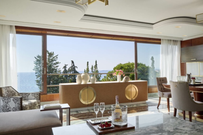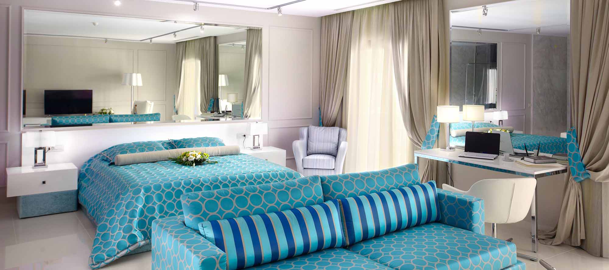 Расположены на верхних этажах, 2 спальни: двуспальная кровать king-size и 2 односпальные кровати, отдельная гостиная комната с диваном и обеденным столом, две ванные комнаты (одна с гидромассажной ванной и одна с душевой кабиной), большой балкон, откуда открывается великолепный вид на Эгейское море, оливковые рощи и ландшафтные сады, бесплатно беседка на пляже, в гостиной в стандартной комплектации имеется один односпальный диван-кровать и диван, дети в возрасте до 12 лет проживают бесплатно на имеющихся кроватях, план номера;