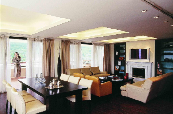 Presidential Suite (~114 кв.м) Спальня с ванной комнатой (ванна с гидромассажем), отдельная гостиная с обеденной зоной, камином и отд. WC, мини-кухня, балкон с мебелью из ротанга с великолепным видом. Максимальное разм. 2 взрослых + 1 ребенок.