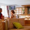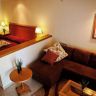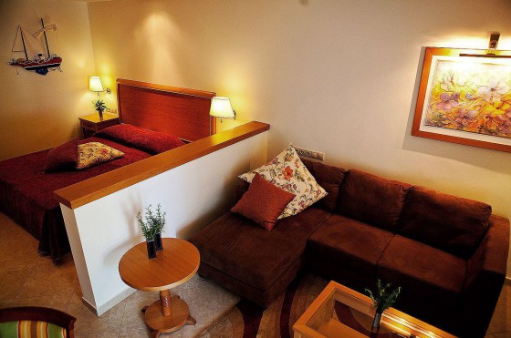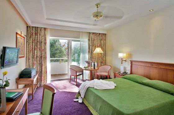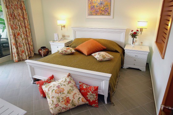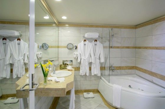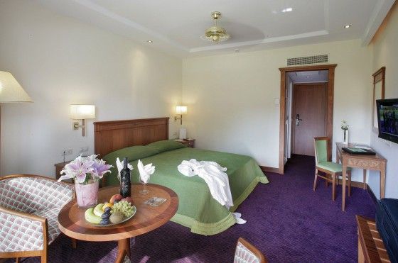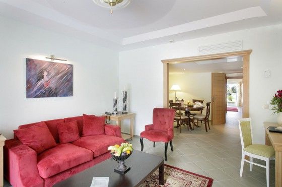 Deluxe suite (60 кв. м) Расположены на 1-ом этаже с террасой с видом на сад. Интерьер выполнен в пастельных тонах. Отдельная спальня с большой двуспальной кроватью и салон/2-ая спальня для детей (2 дивана), гардеробная, большая ванная комната (ванна с джакузи) и вторая ванная комната с душевой (банные халаты, тапочки, фен, набор для душа, парфюмерный набор по уходу за лицом и телом, весы), центральный кондиционер с индивидуальным пультом управления, телефон, 2 телевизора с плазменным экраном (спутниковое телевидение, российский канал), DSL интернет-соединение, мини-бар (за доплату), сейф (бесплатно), круглосуточная служба обслуживания номеров, вечерний сервис, пол с керамическим покрытием (плитка). По прибытию - вино, фрукты и букет цветов в номер.