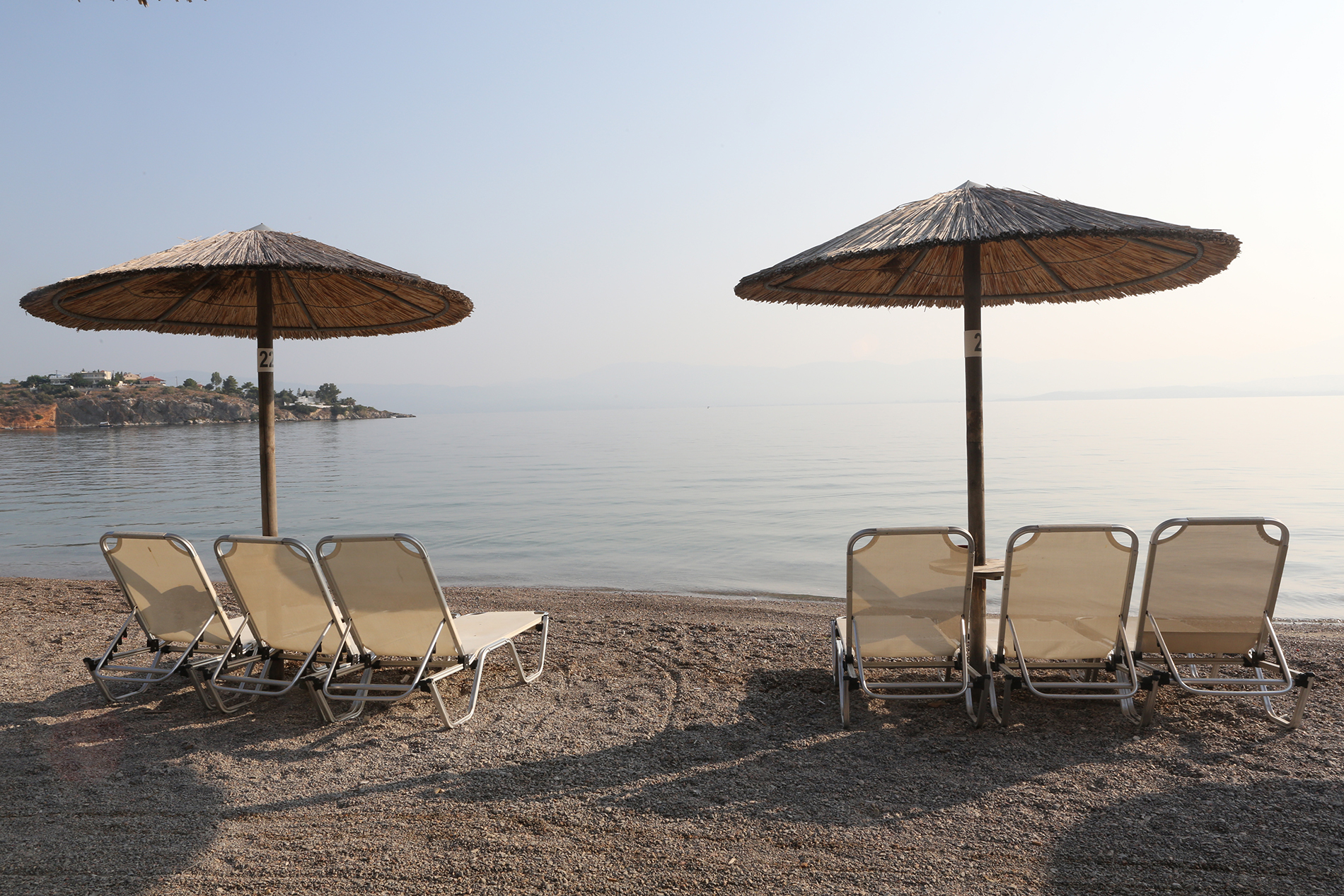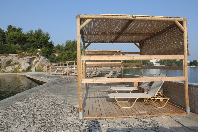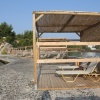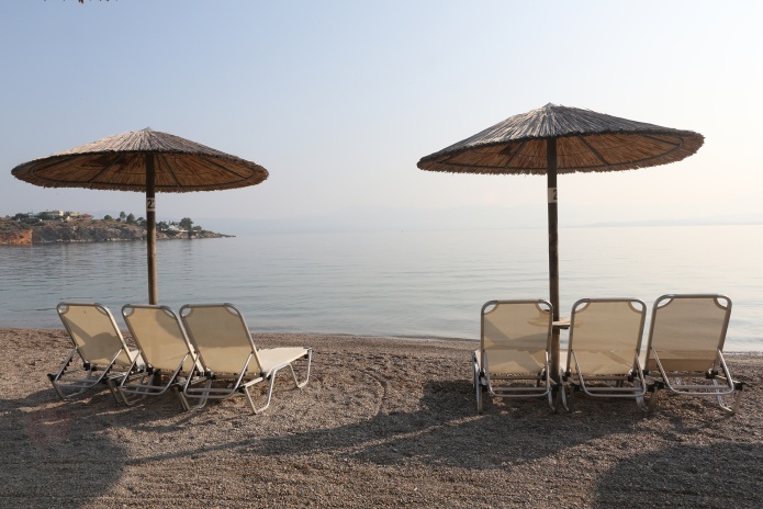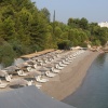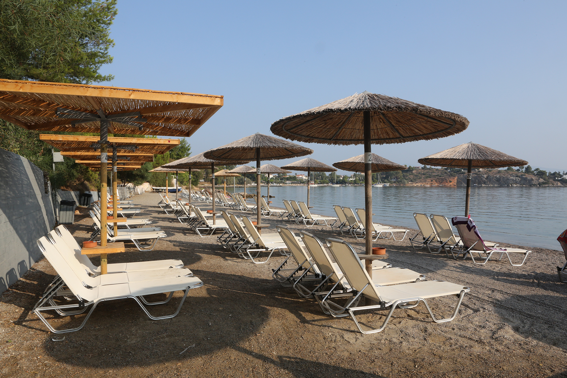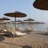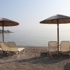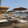 Песчаный пляж с бесплатными лежаками и зонтиками.