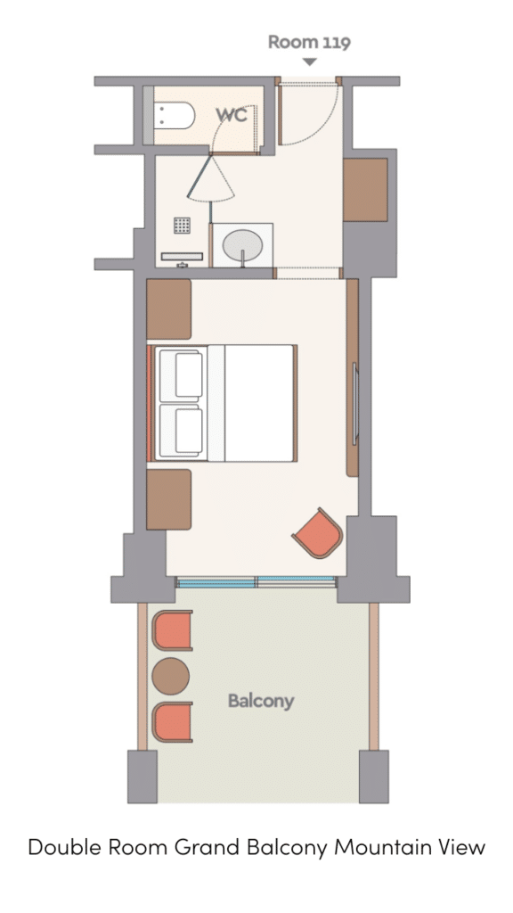 Двуспальная кровать queen-size или 2 односпальные кровати, ванная комната с душем, меблированный балкон (2 кресла-мешка (пуфа) и столик на балконе), вид на горы, план номера, фото номера;