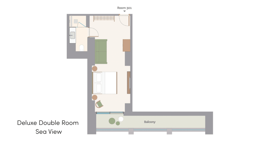 Двуспальная кровать king-size, ванная комната с душем, меблированный балкон, прямой вид на море, план номера, фото номера;
