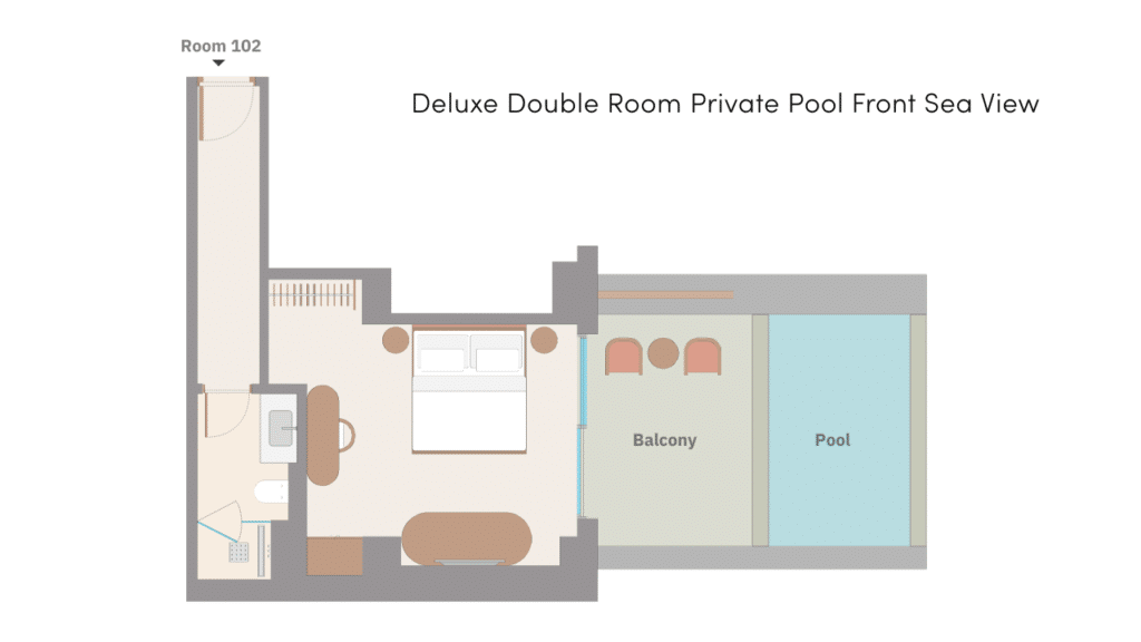 Двуспальная кровать king-size, диван-софа, ванная комната с душем, балкон, небольшой персональный бассейн, боковой вид на море, план номера, фото номера;