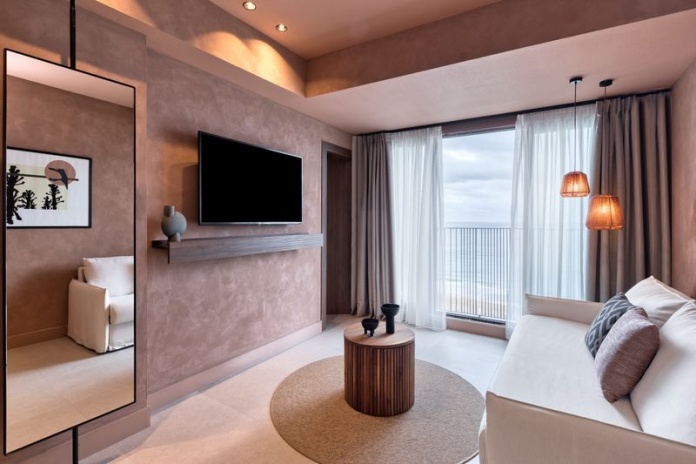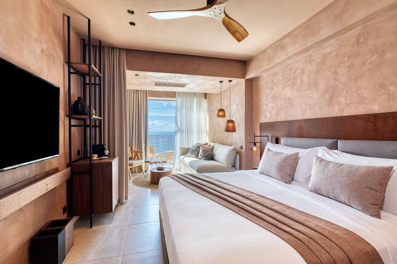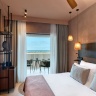 Номера с видом на море, двуспальная кровать, гостиная зона с диваном-софа, ванная комната с душем, терраса с прямым доступом к общему бассейну;