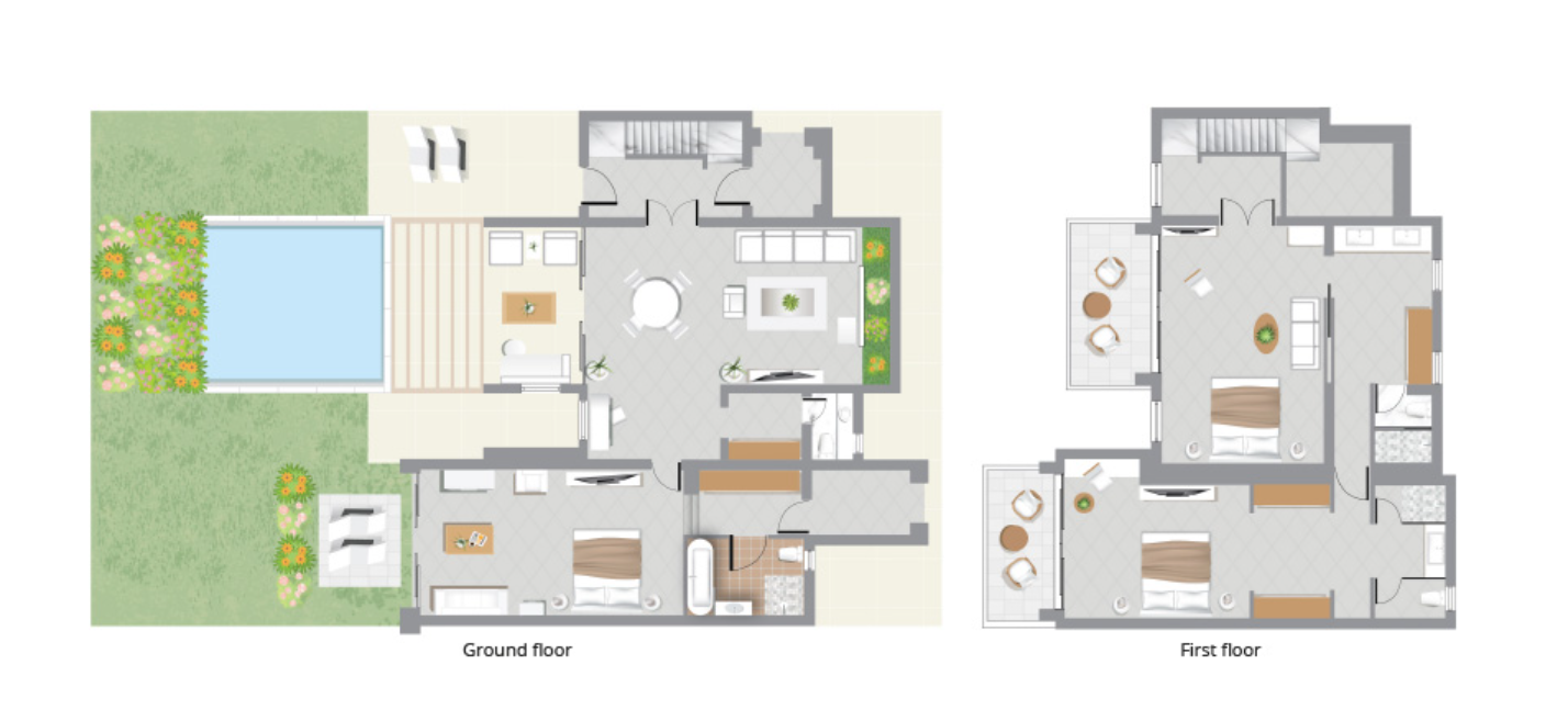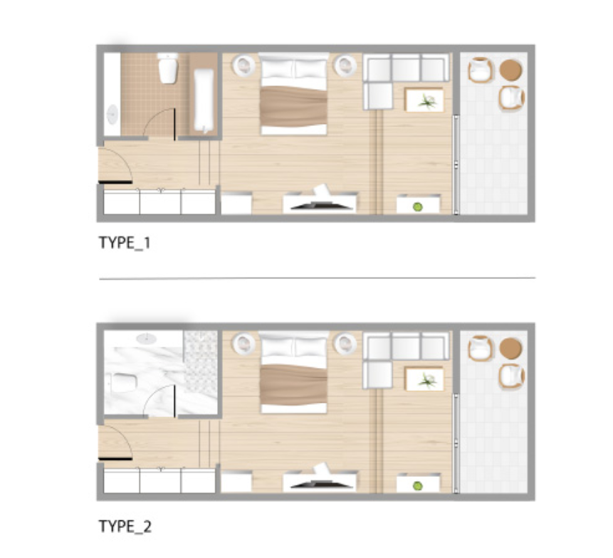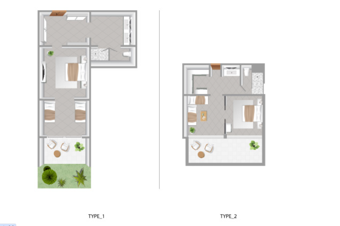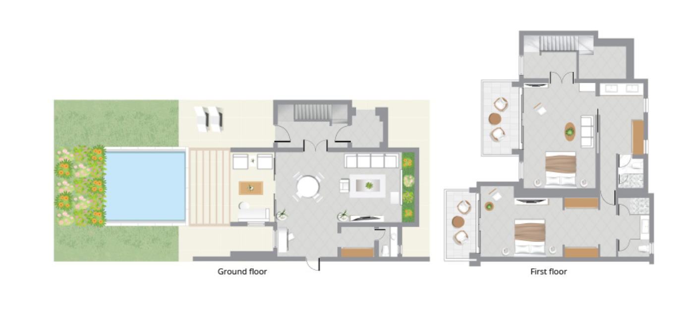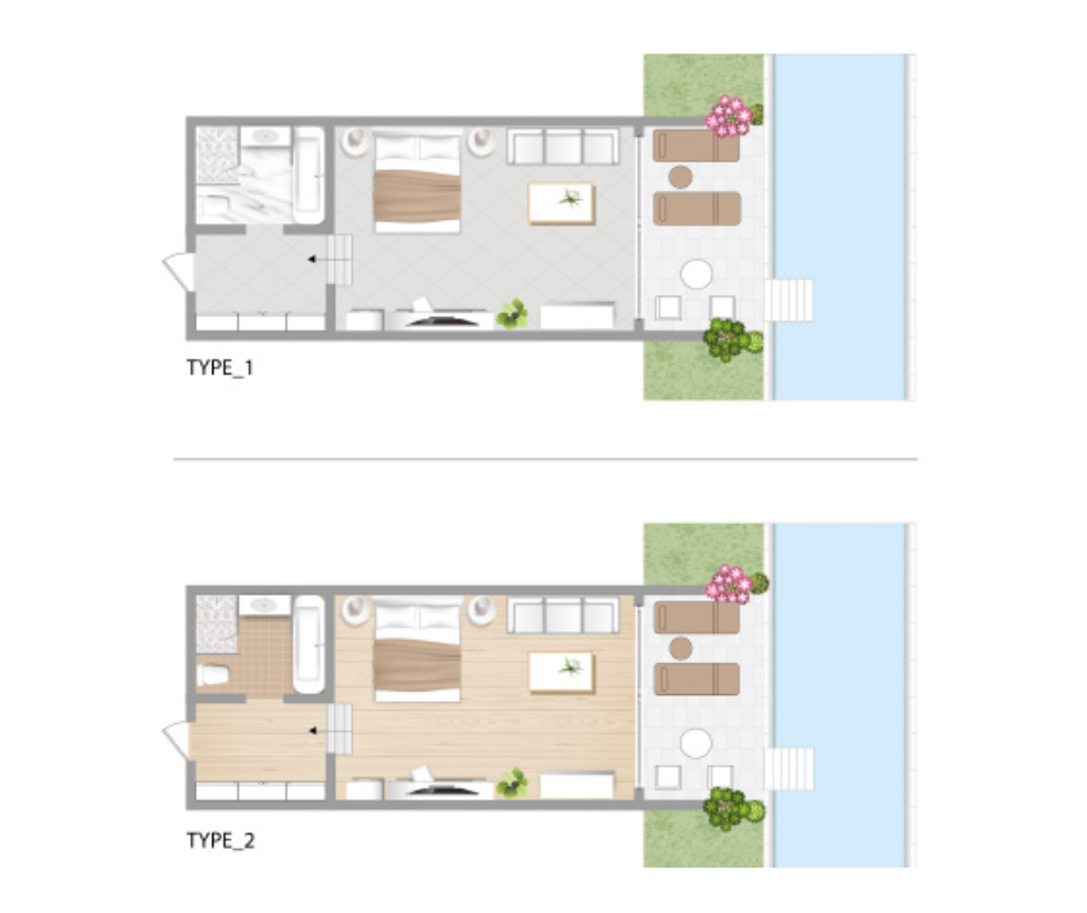 Номера расположены на цокольном этаже, открытая планировка, двуспальная или 2 односпальные кровати, 2 дивана-софа, ванная комната с ванной или душем, веранда (6 м²) с лежаком, прямой доступ к общему бассейну, план номера;