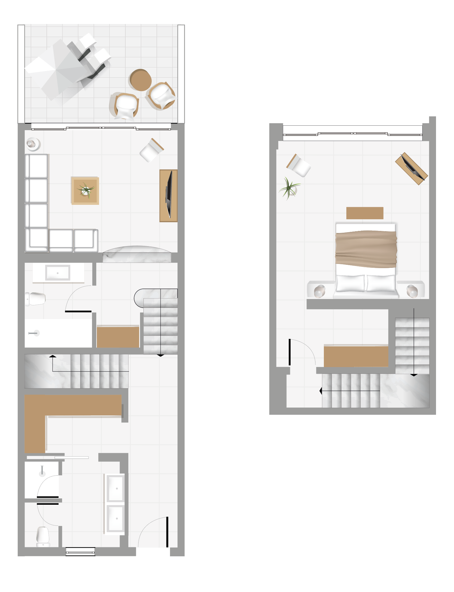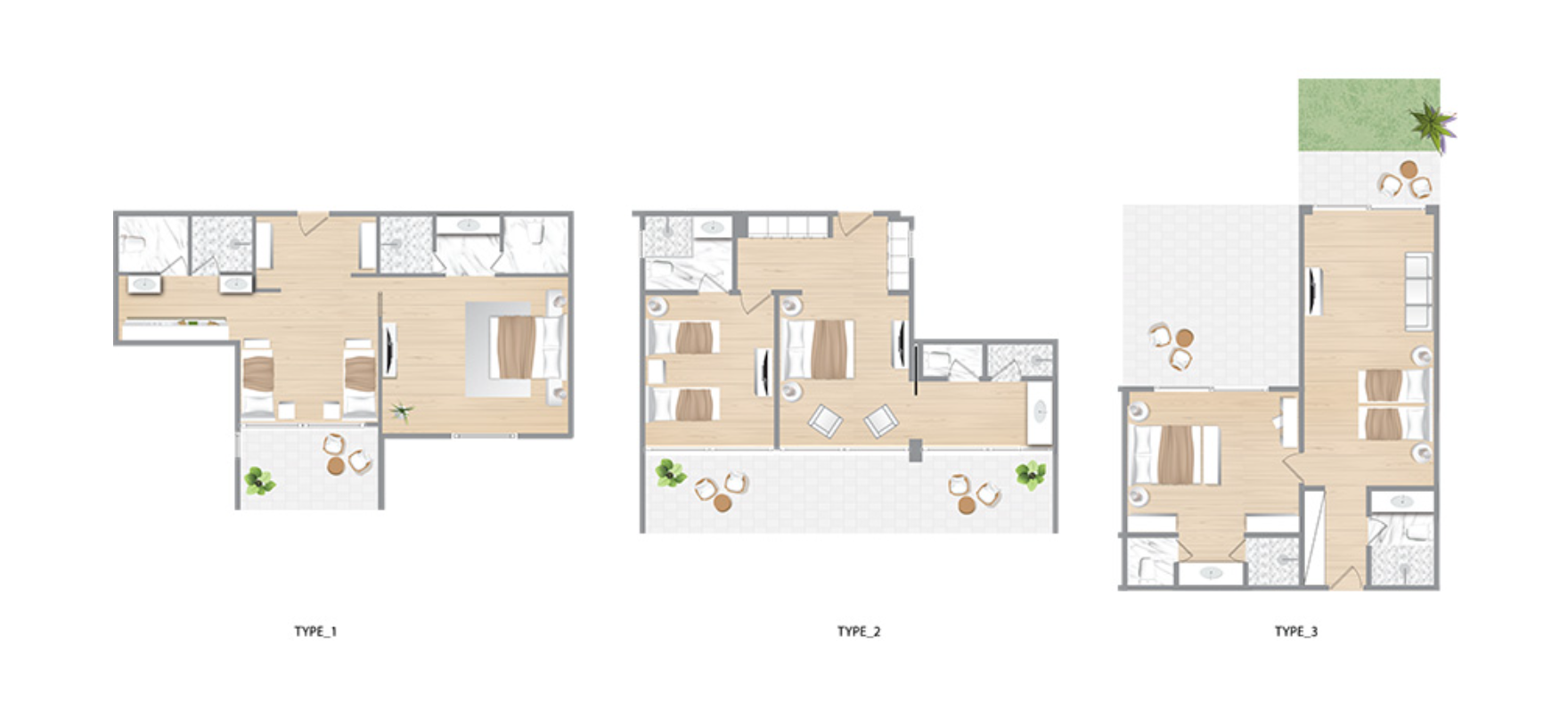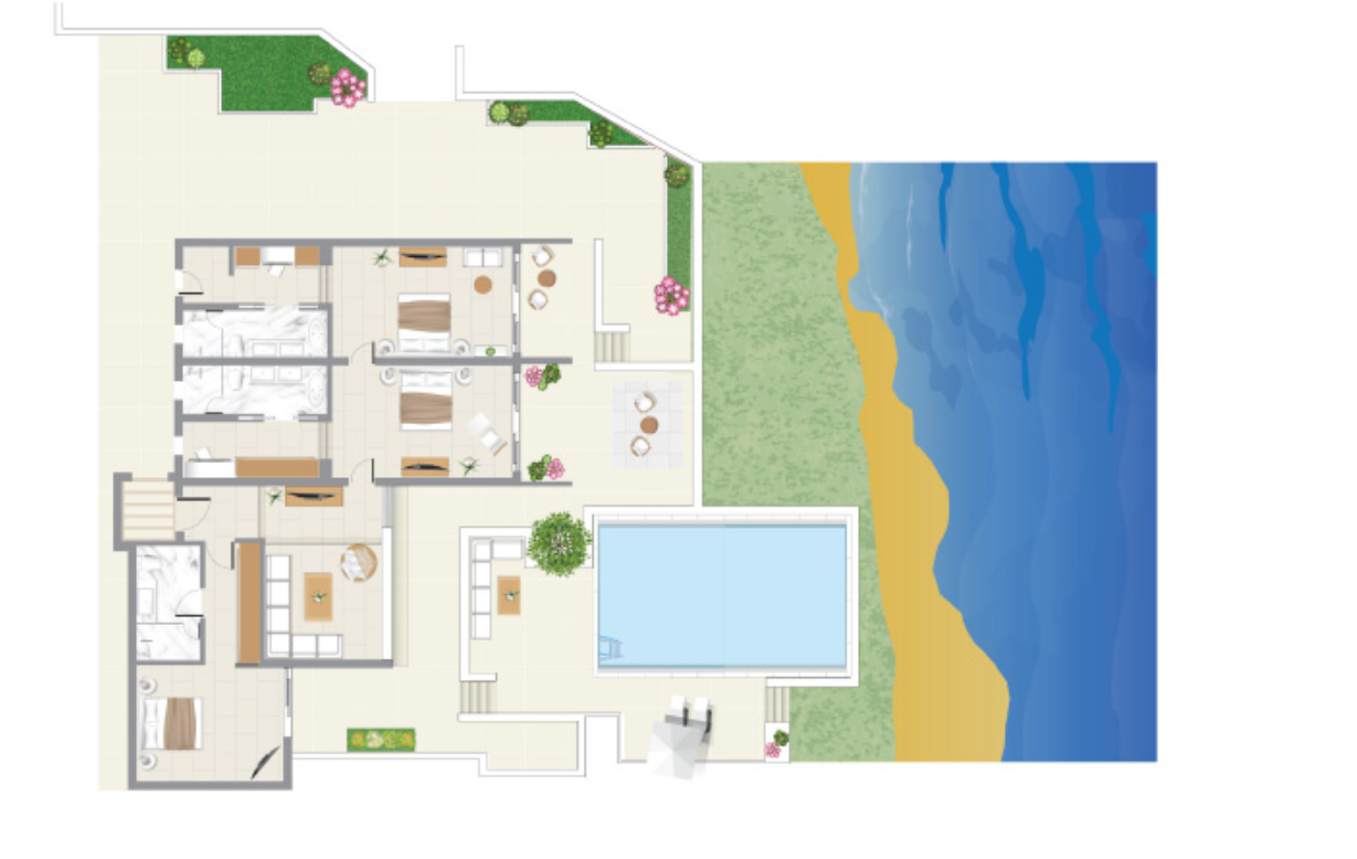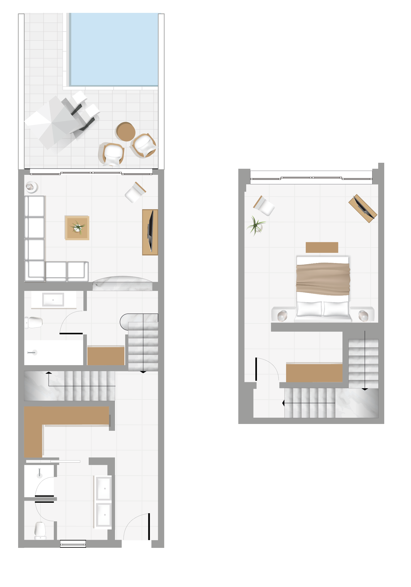 Номера расположены на цокольном этаже, открытая планировка, двуспальная или 2 односпальные кровати, 2 дивана-софа, ванная комната с ванной или душем, веранда (6 м²) с лежаком, прямой доступ к общему бассейну, план номера;