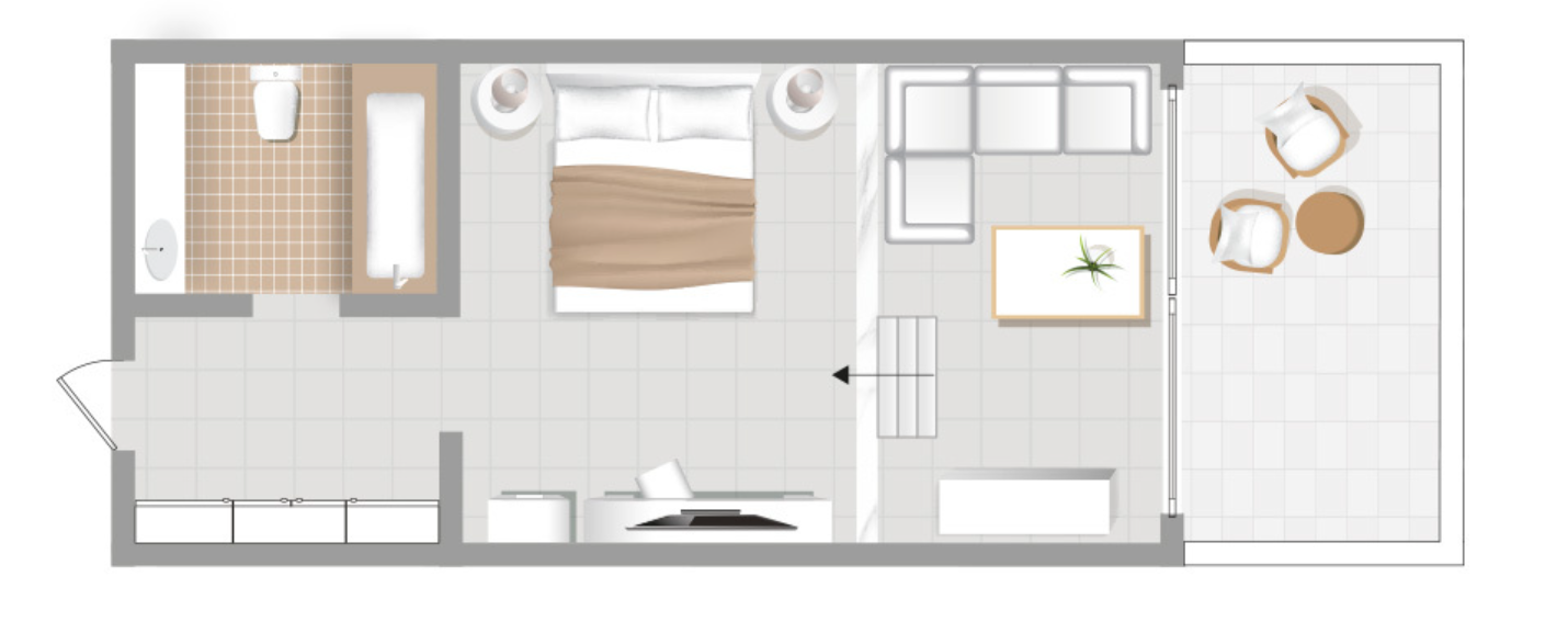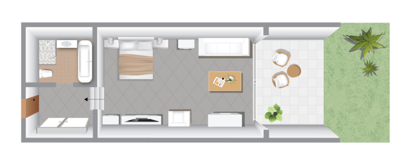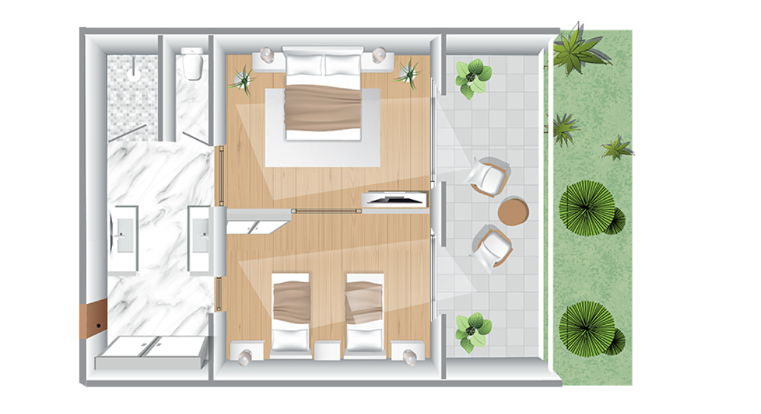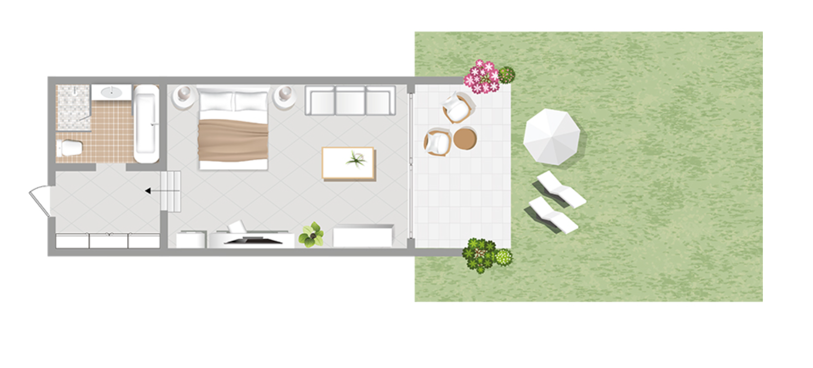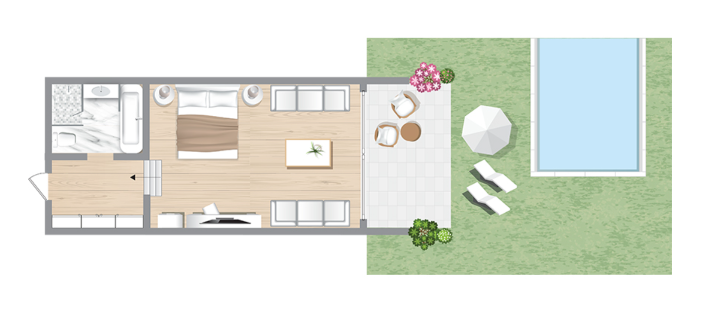 Открытая планировка, двуспальная или 2 односпальные кровати, диван-софа, ванная комната с ванной или душем, веранда (6 м²) с лежаком, прямой доступ к общему бассейну, план номера;