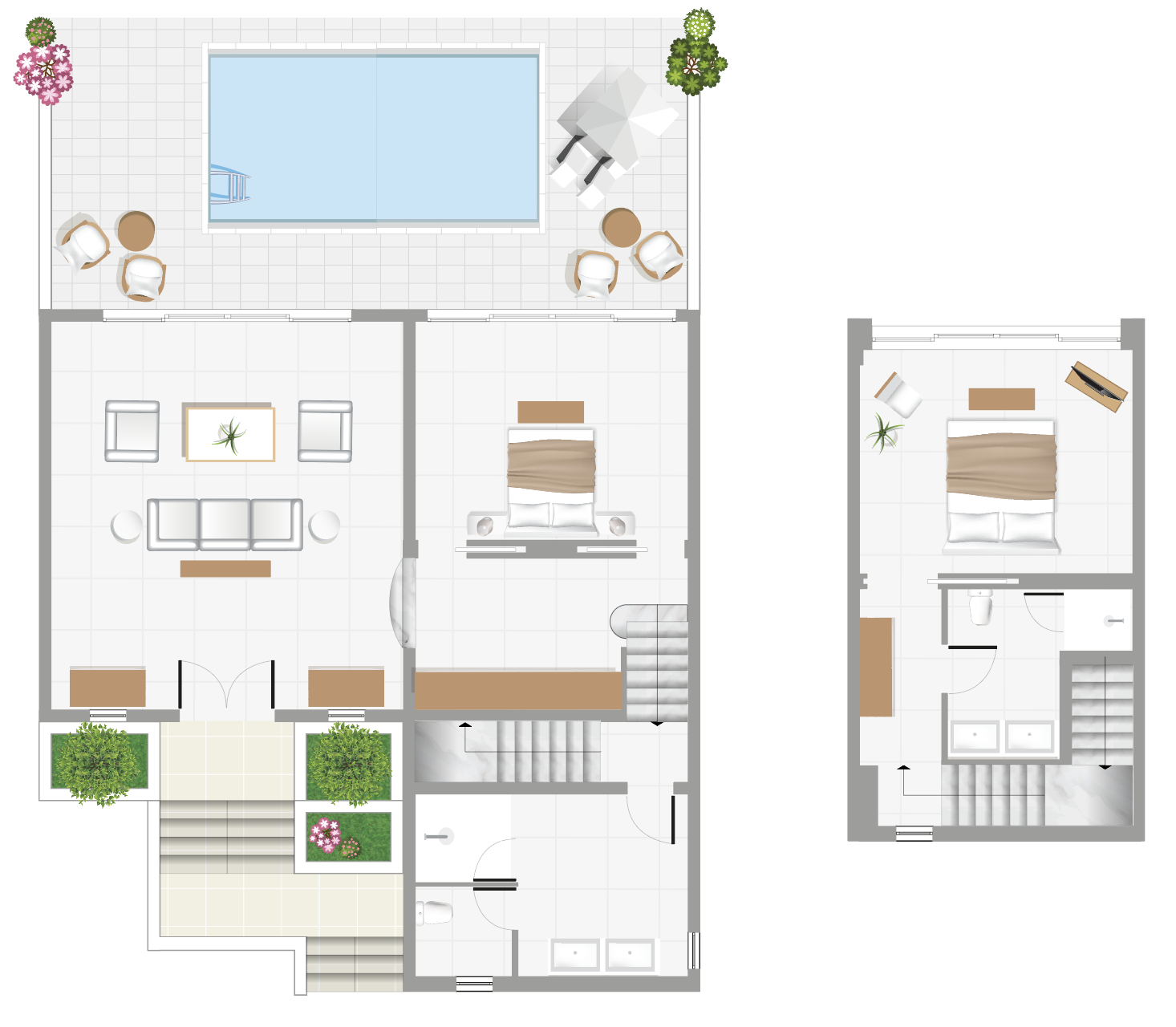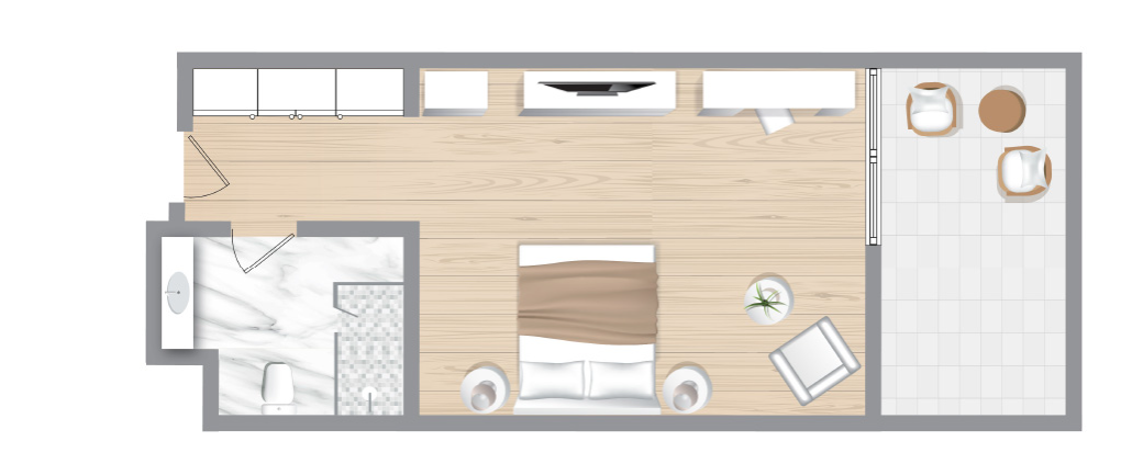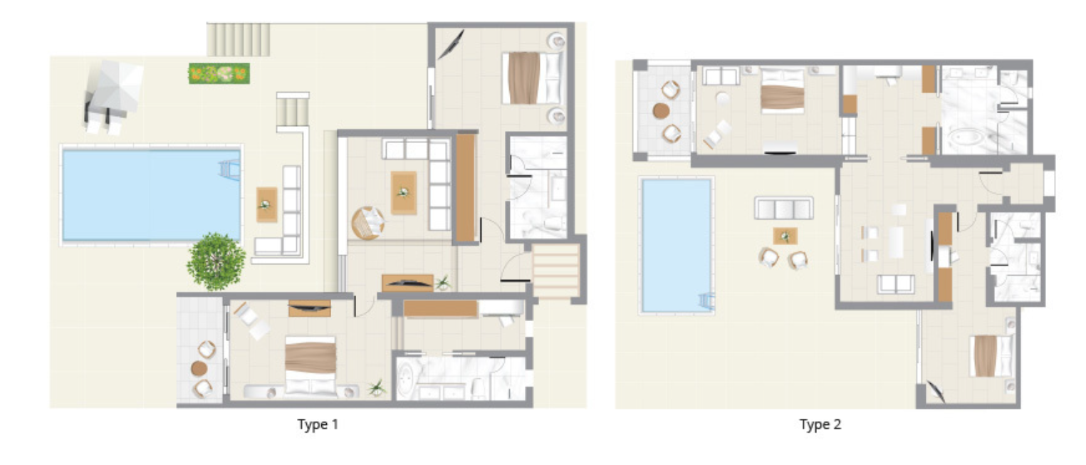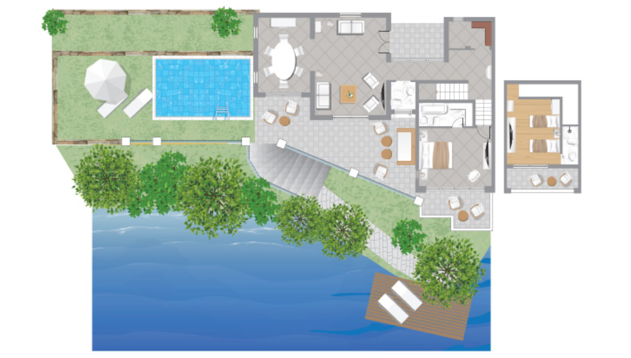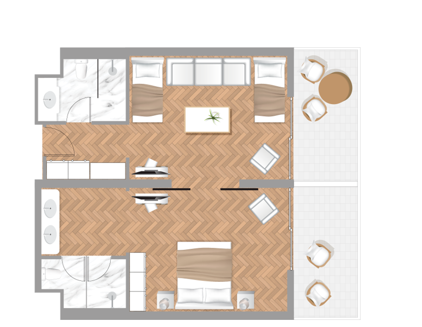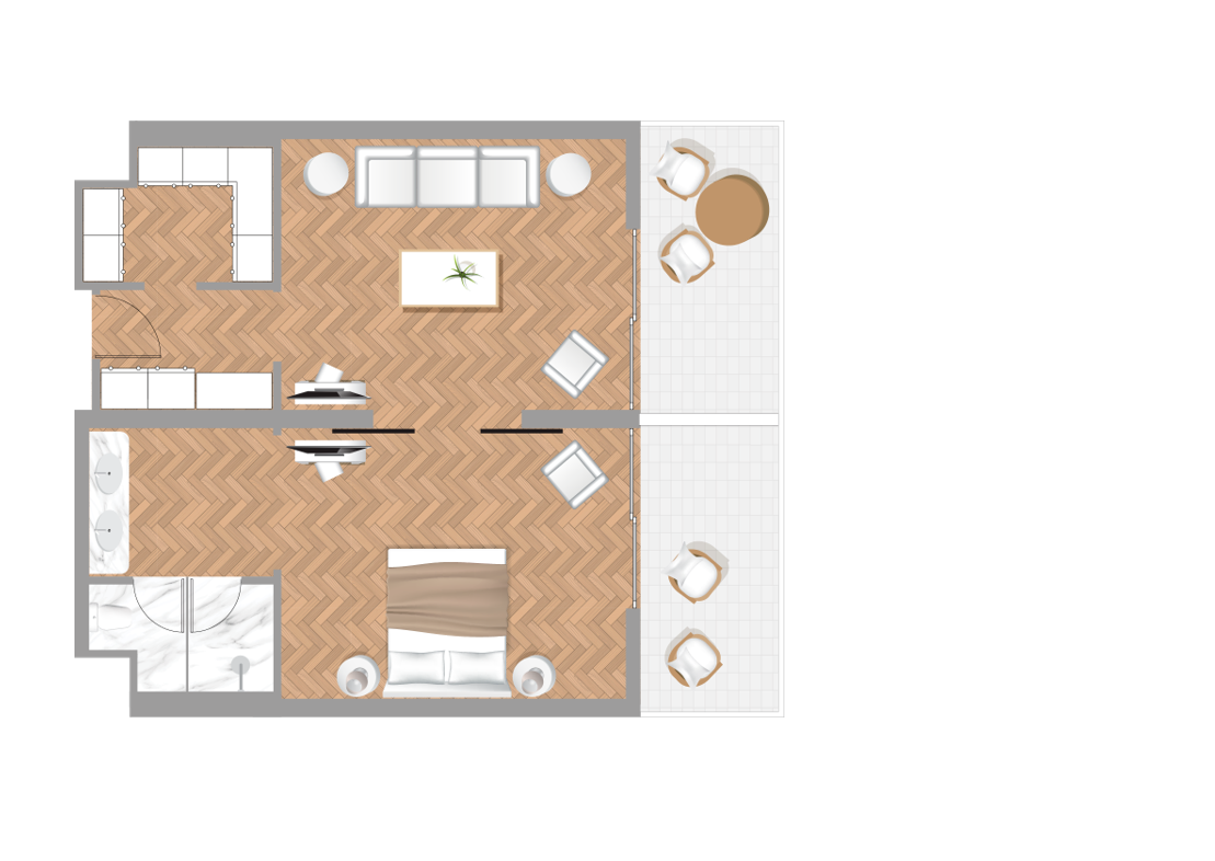 Открытая планировка, двуспальная или 2 односпальные кровати, диван-софа, ванная комната с ванной или душем, веранда (6 м²) с лежаком, прямой доступ к общему бассейну, план номера;